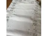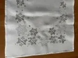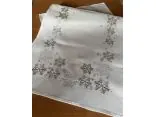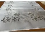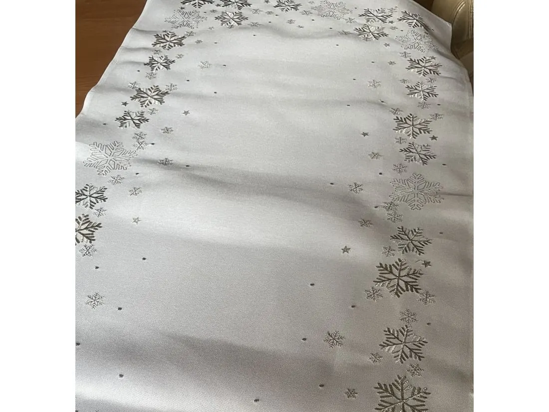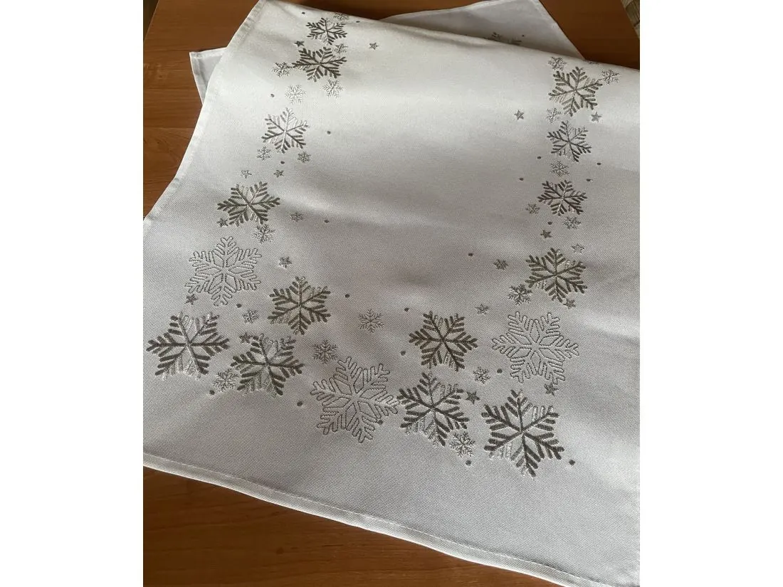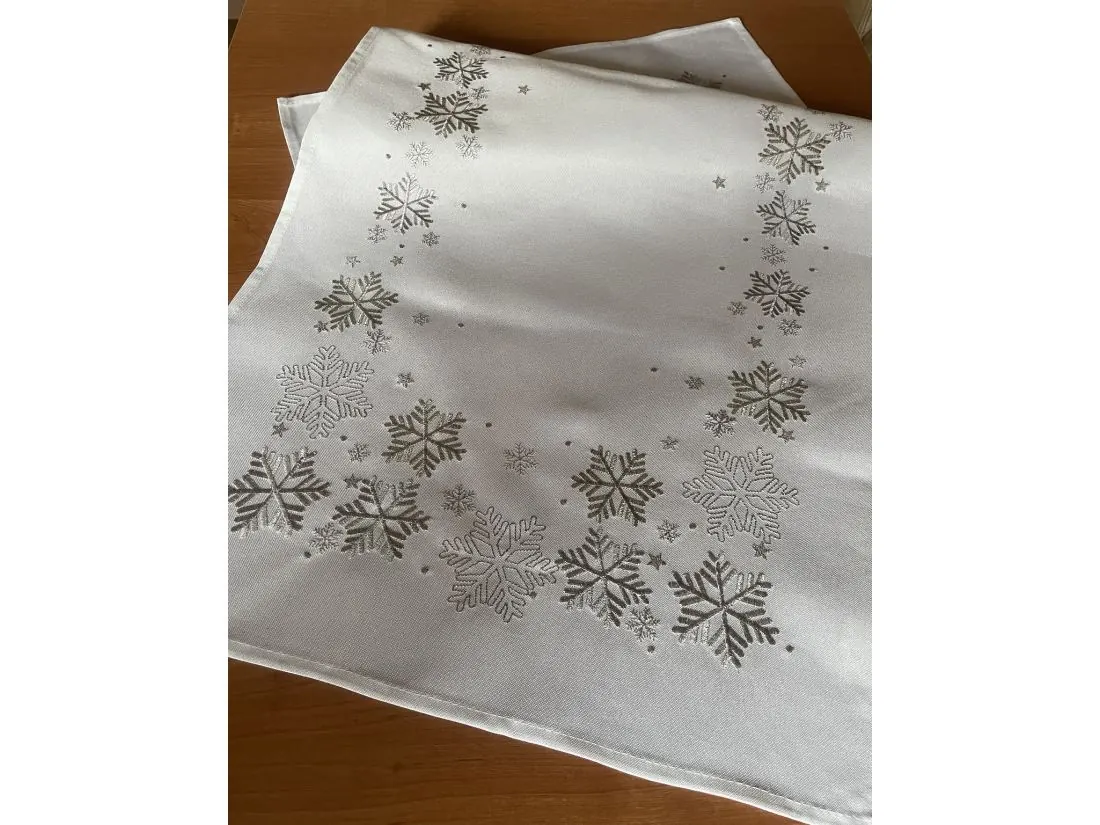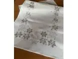 Bieżnik świąteczny w rozmiarze 40x140 cm w kolorze białym z bogato zdobioną aplikacją srebrnych śnieżynek została wykonana na tkaninie 100 % poliestrowej, charakteryzuje się nowoczesnym designem, świątecznym wzorem oraz modnym kolorem.