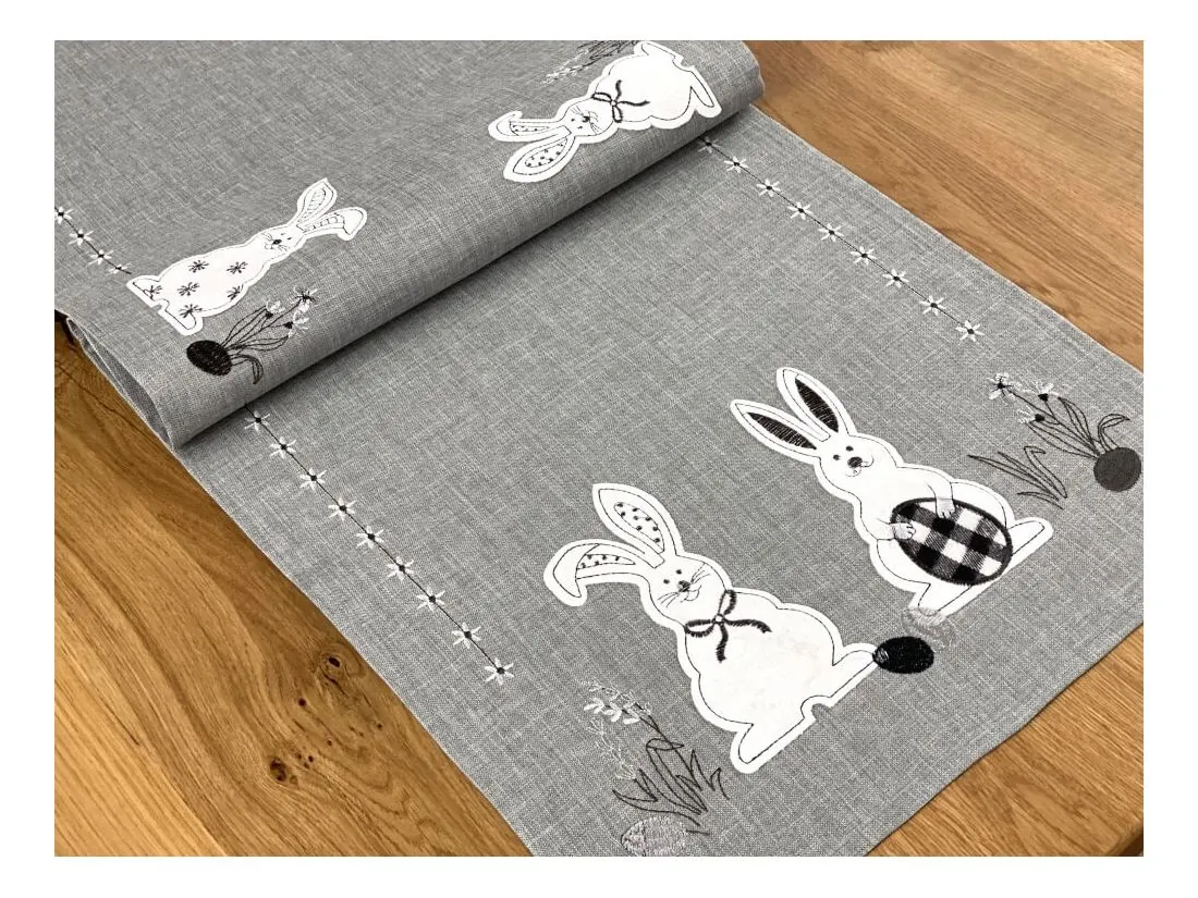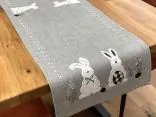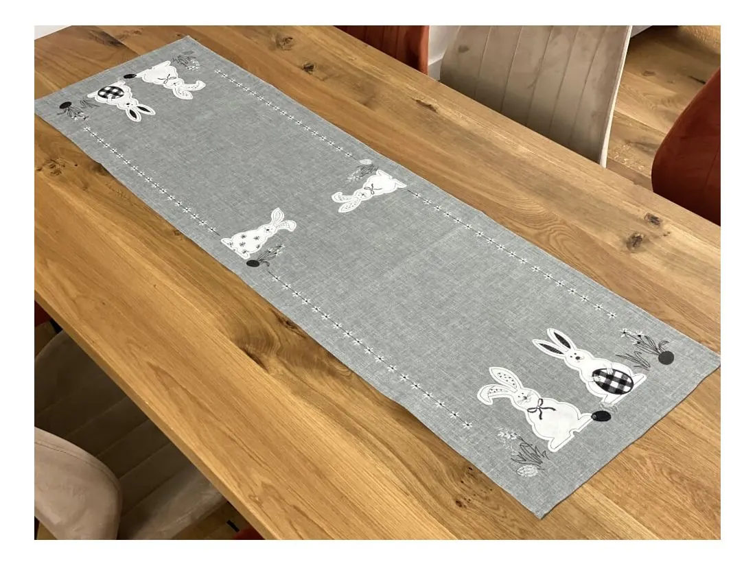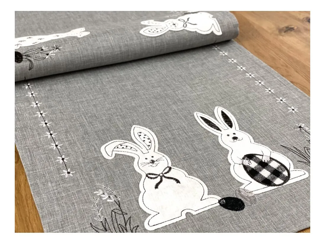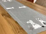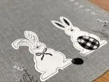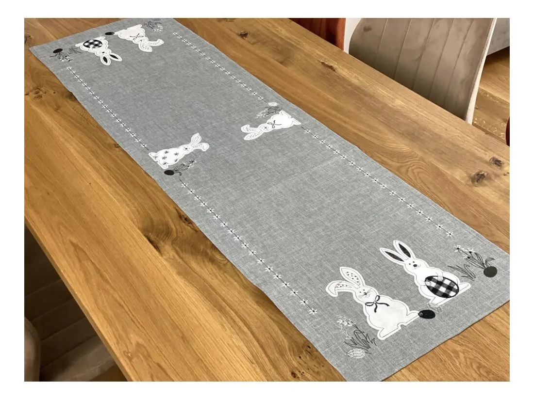 Na szarym tle bieżnika znajdują się trzy urocze wielkanocne zajączki, które wprowadzają radosny, świąteczny klimat. Dzięki neutralnej kolorystyce i subtelnemu wzornictwu bieżnik doskonale komponuje się z różnymi stylami wnętrz, nadając stołowi lekkości i świeżości. Świetnie sprawdzi się zarówno na co dzień, jak i podczas wielkanocnych spotkań w gronie najbliższych.
