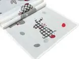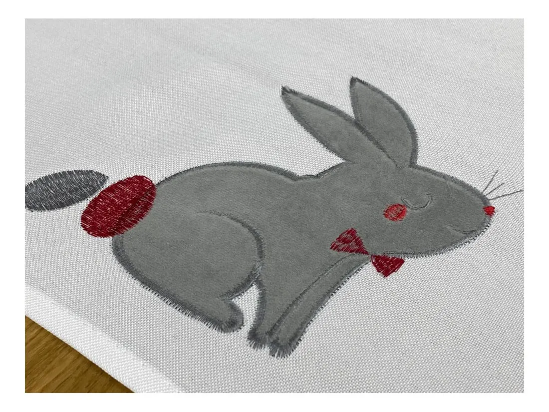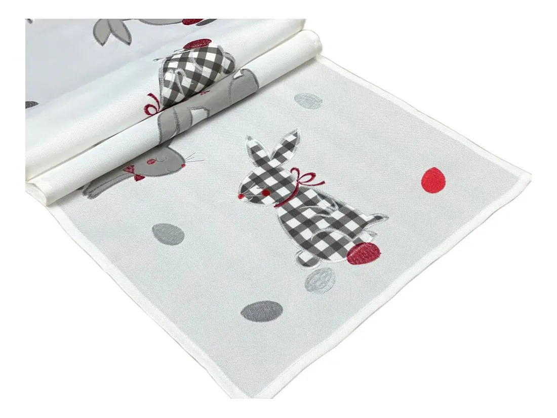 Nakładka świąteczna w rozmiarze 40x140 cm w kolorze białym z aplikacja wesołych dwóch zajączków, została wykonana z tkaniny 100 % poliestrowej, charakteryzuje się nowoczesnym designem, świątecznym nastrojowym wzorem oraz modnym kolorem dodatkową ozdobą jest haft wokół serwetki.