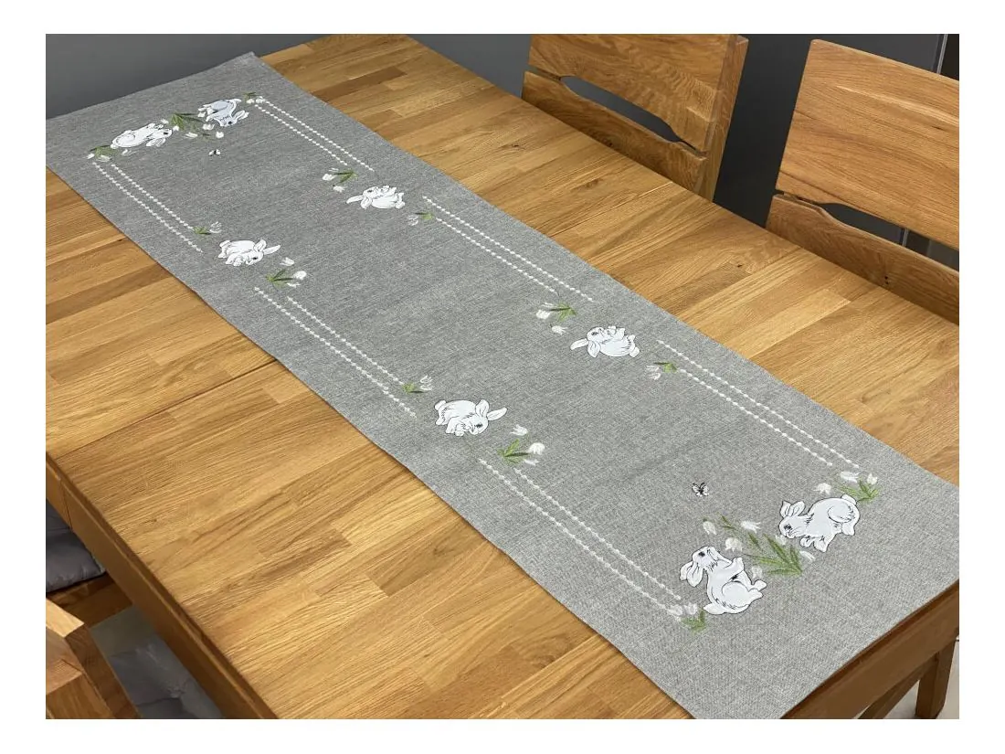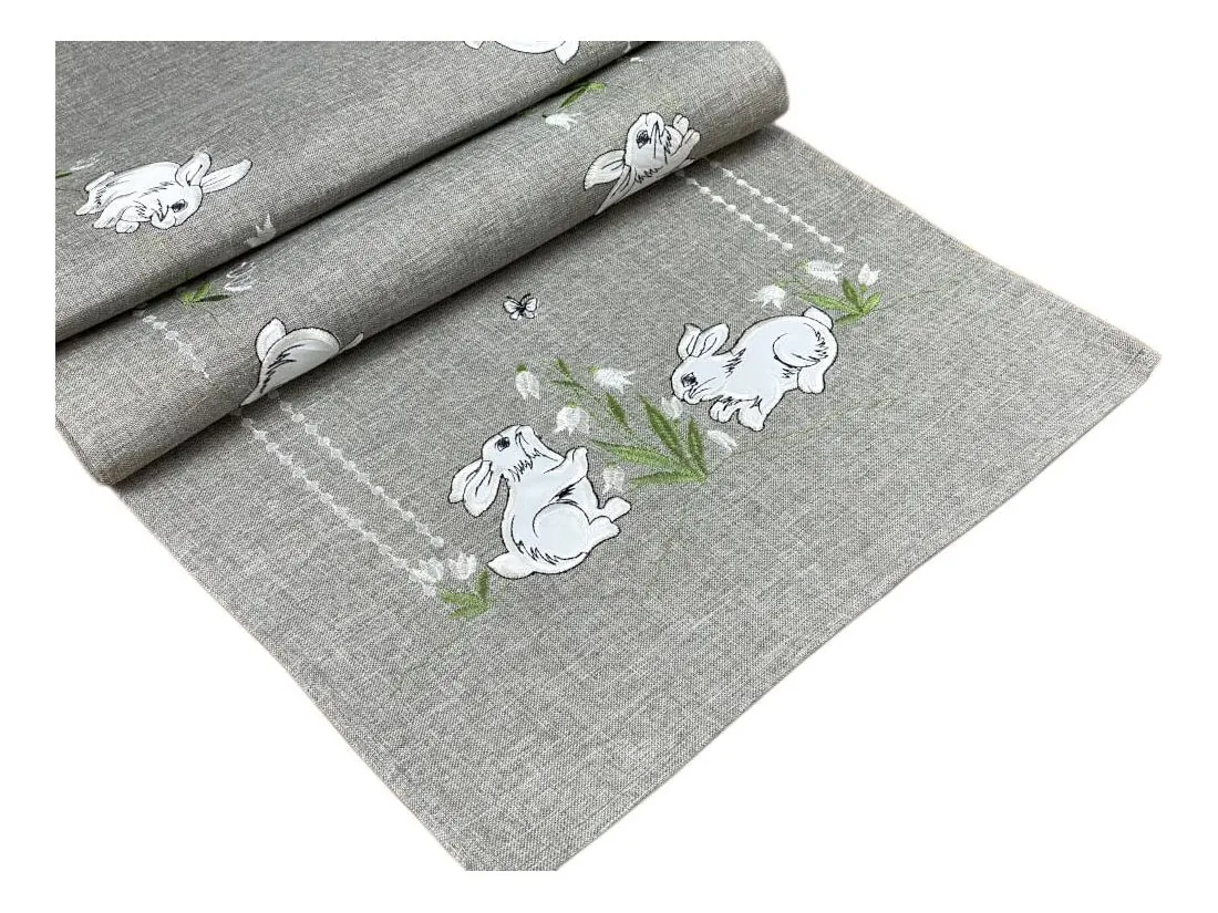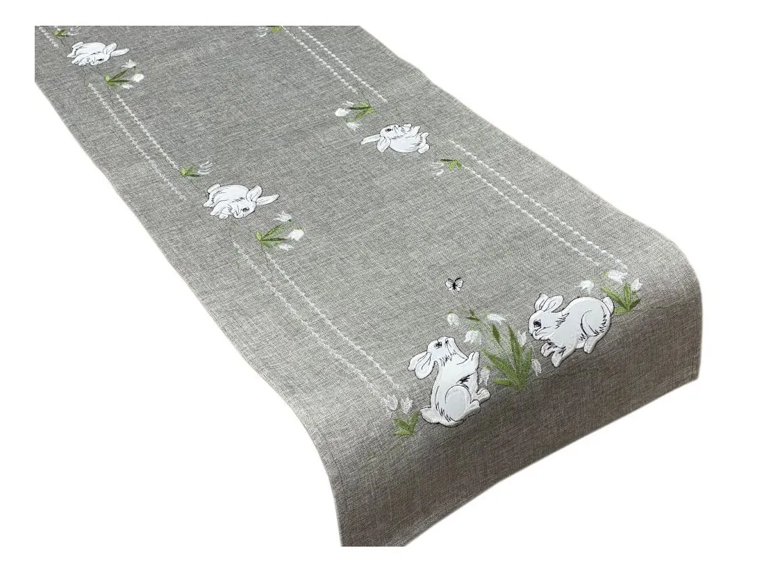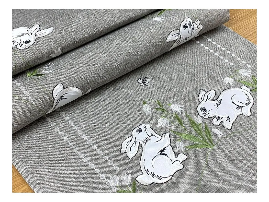 Nakładka świąteczna w rozmiarze 40x140 cm w kolorze popielatym z aplikacja wesołych dwóch zajączków, została wykonana z tkaniny 100 % poliestrowej, charakteryzuje się nowoczesnym designem, świątecznym nastrojowym wzorem oraz modnym kolorem dodatkową ozdobą jest haft wokół serwetki.