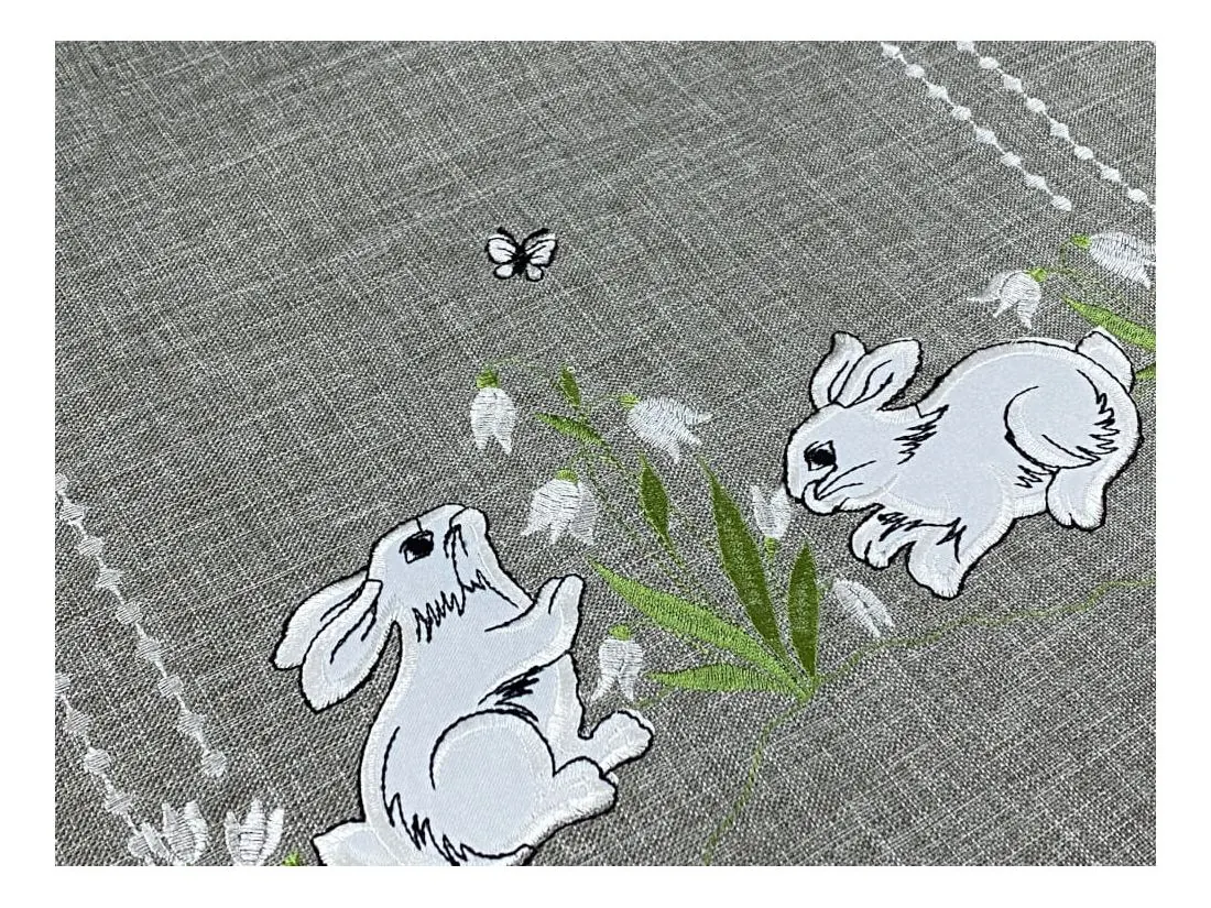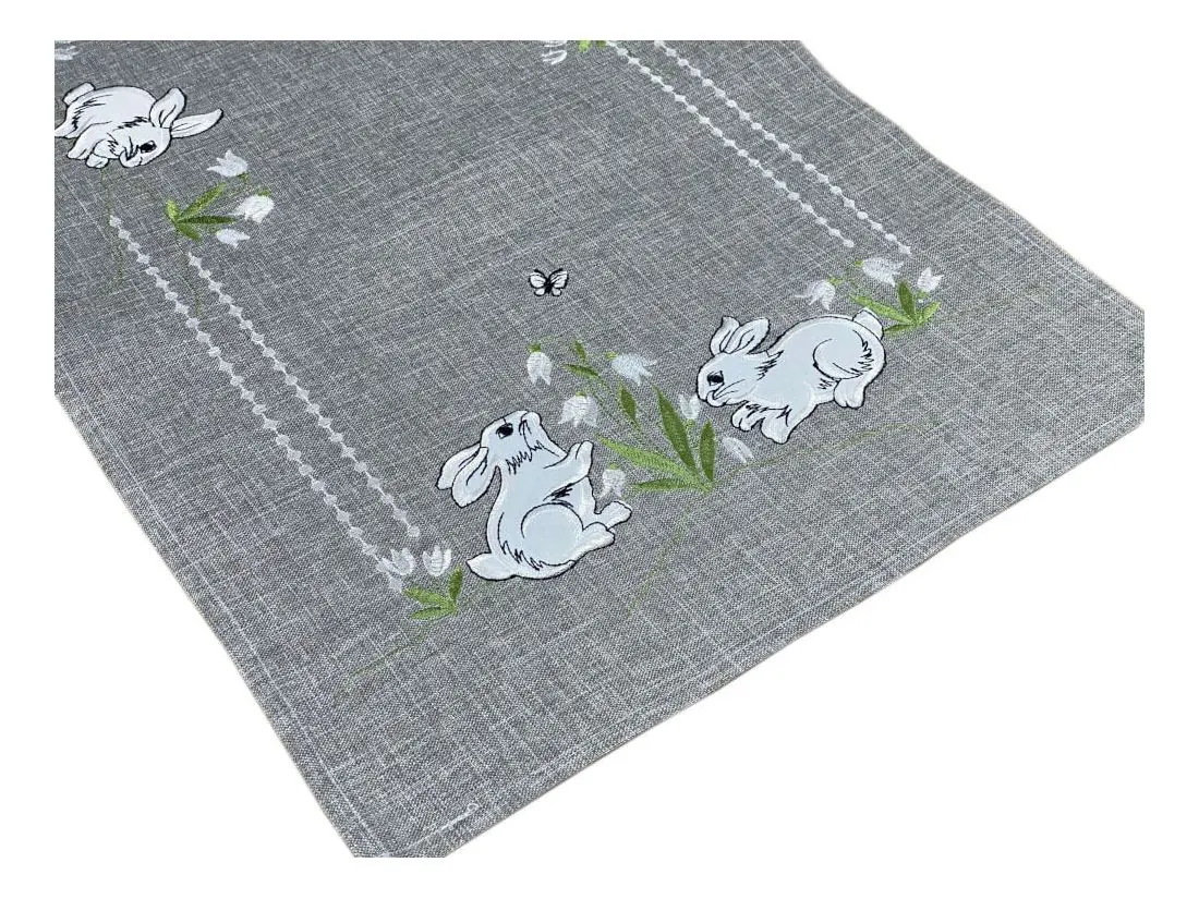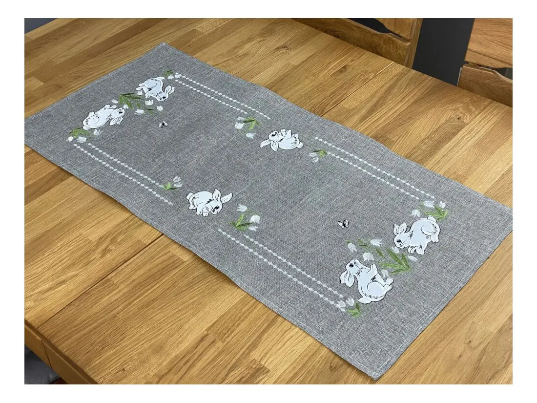 Nakładka świąteczna w rozmiarze 40x90 cm w kolorze popielatym z aplikacja wesołych dwóch zajączków, została wykonana z tkaniny 100 % poliestrowej, charakteryzuje się nowoczesnym designem, świątecznym nastrojowym wzorem oraz modnym kolorem dodatkową ozdobą jest haft wokół serwetki.