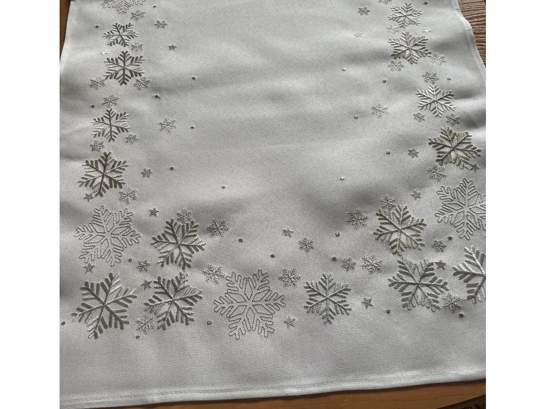 Bieżnik świąteczny w rozmiarze 60x120 cm w kolorze białym z bogato zdobioną aplikacją srebrnych śnieżynek została wykonana na tkaninie 100 % poliestrowej, charakteryzuje się nowoczesnym designem, świątecznym wzorem oraz modnym kolorem.