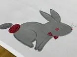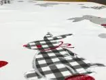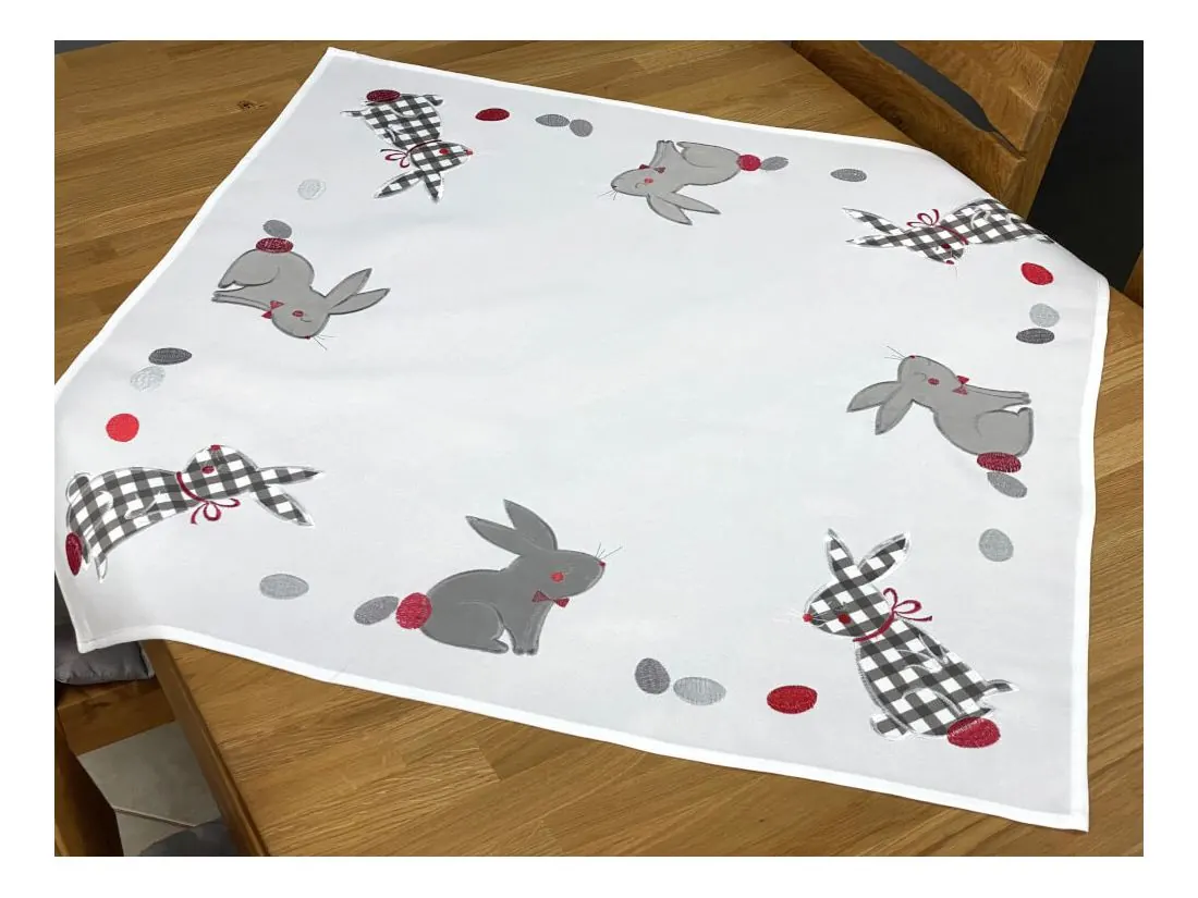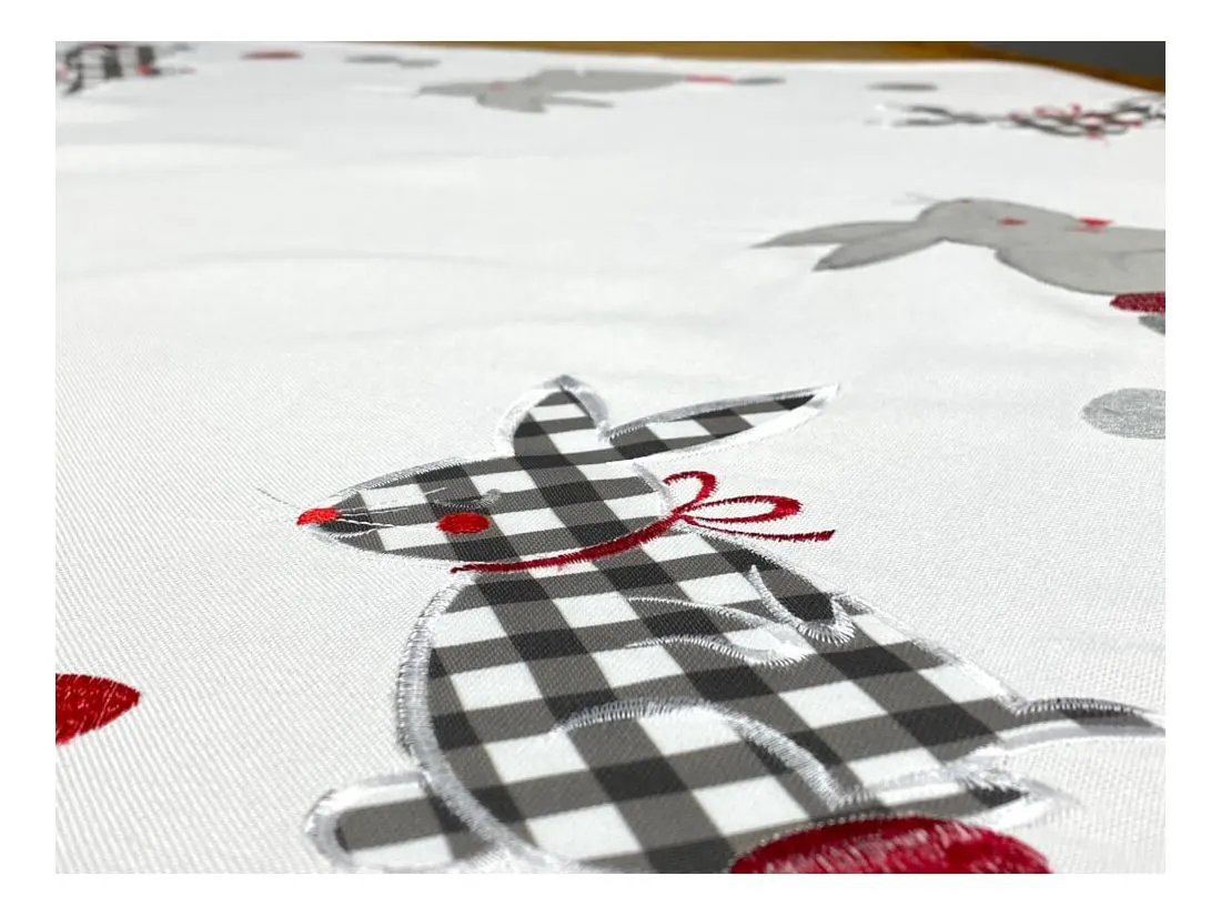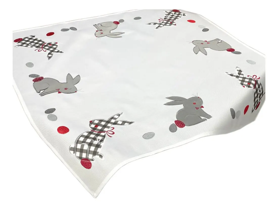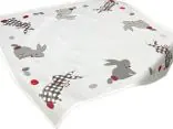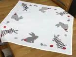 Nakładka świąteczna w rozmiarze 85 x 85 cm w kolorze białym z aplikacja wesołych dwóch zajączków, została wykonana z tkaniny 100 % poliestrowej, charakteryzuje się nowoczesnym designem, świątecznym nastrojowym wzorem oraz modnym kolorem dodatkową ozdobą jest haft wokół serwetki.