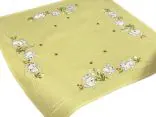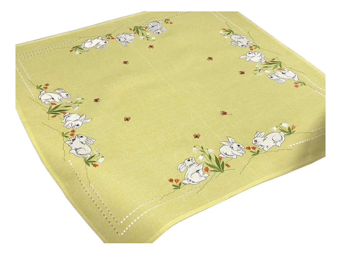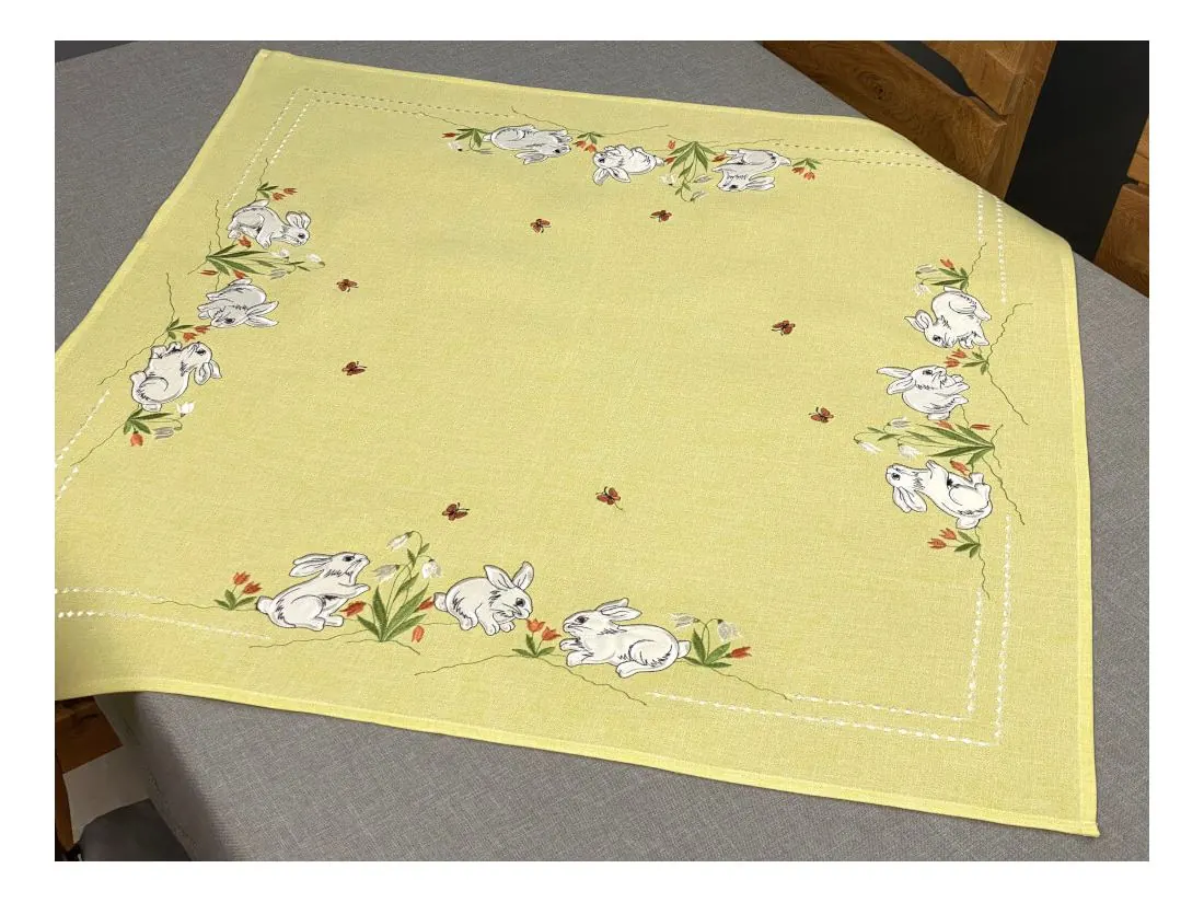 Nakładka świąteczna w rozmiarze 85x85 cm w kolorze żółtym z aplikacja wesołych dwóch zajączków, została wykonana z tkaniny 100 % poliestrowej, charakteryzuje się nowoczesnym designem, świątecznym nastrojowym wzorem oraz modnym kolorem dodatkową ozdobą jest haft wokół serwetki.