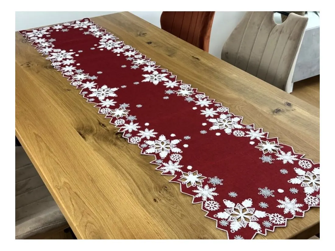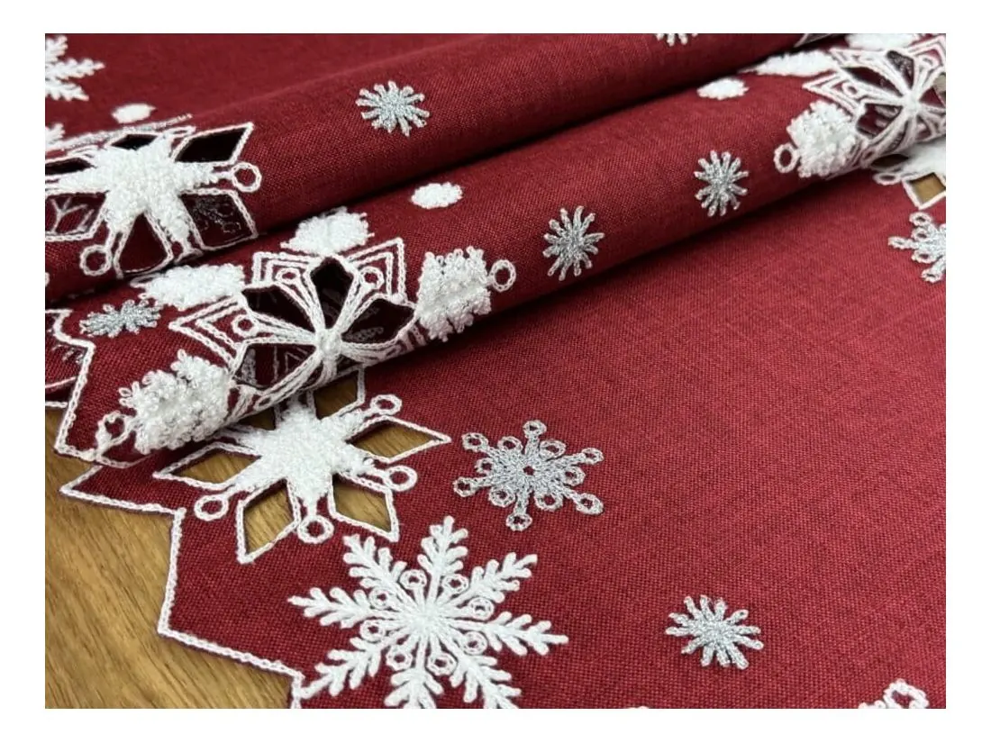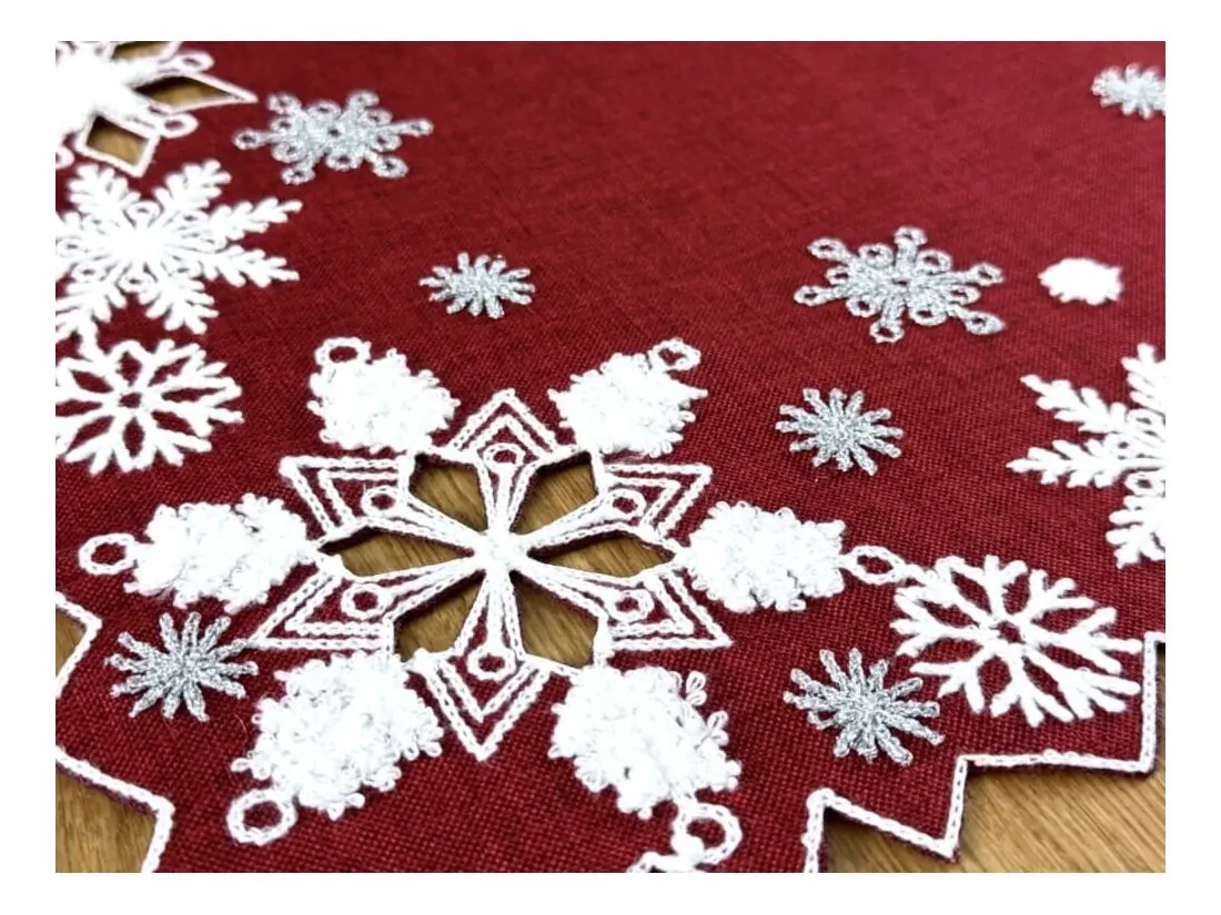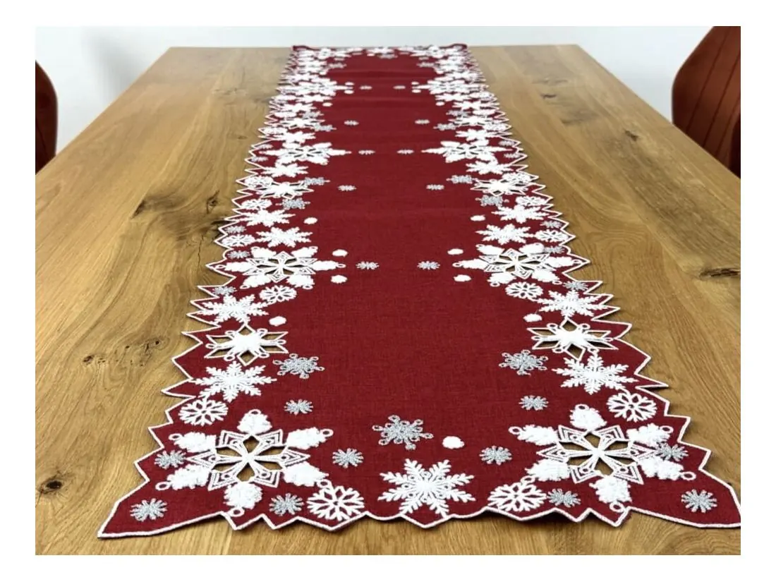 Nakładkę zdobią subtelne, białe śnieżynki wykonane techniką haftu, które w piękny sposób symbolizują radosny czas świąteczny. Misternie haftowane śnieżynki tworzą elegancki wzór, wprowadzając do wnętrza atmosferę zimowej krainy.