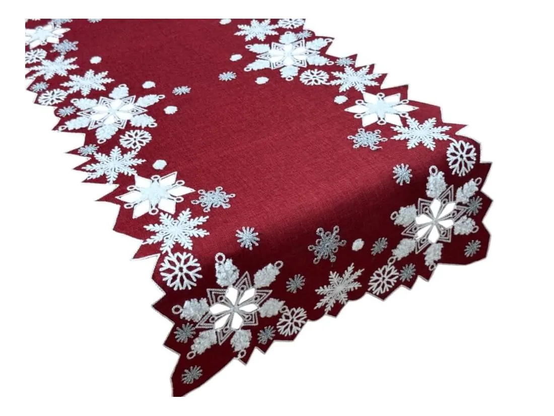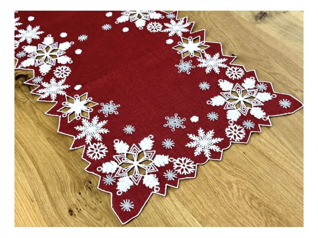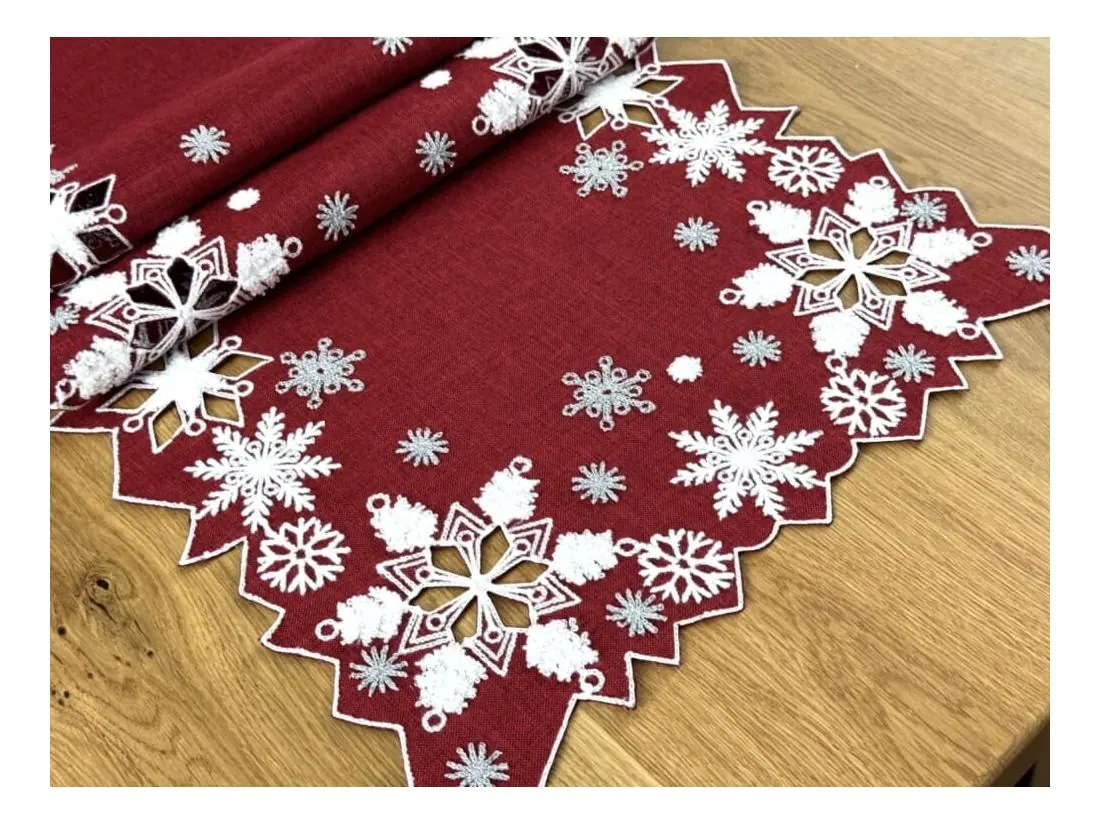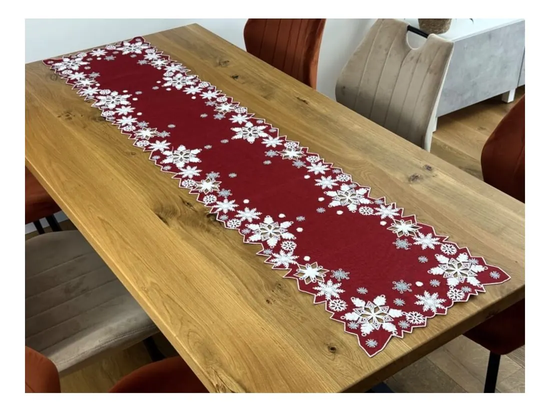 Nakładkę zdobią subtelne, białe śnieżynki wykonane techniką haftu, które w piękny sposób symbolizują radosny czas świąteczny. Misternie haftowane śnieżynki tworzą elegancki wzór, wprowadzając do wnętrza atmosferę zimowej krainy.