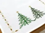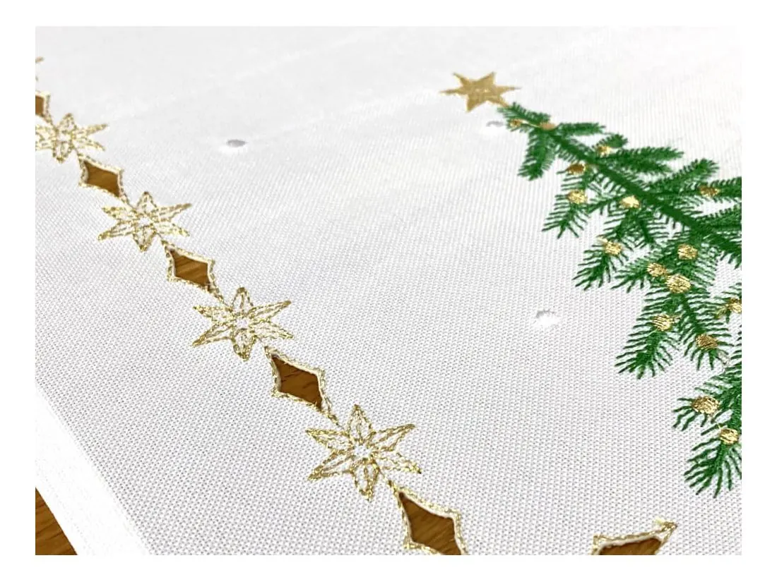 Bieżnik świąteczny w rozmiarze 40x174 cm w kolorze białym z bogato zdobioną aplikacją zielonych choinek w otoczeniu złotych gwiazdek, została wykonana na tkaninie 100 % poliestrowej, charakteryzuje się nowoczesnym designem, świątecznym wzorem oraz modnym kolorem. Dodatkową ozdobą nakładki są wycięcia wzdłuż bieżnika w formie złotego łańcuszka z magicznych gwiazdek