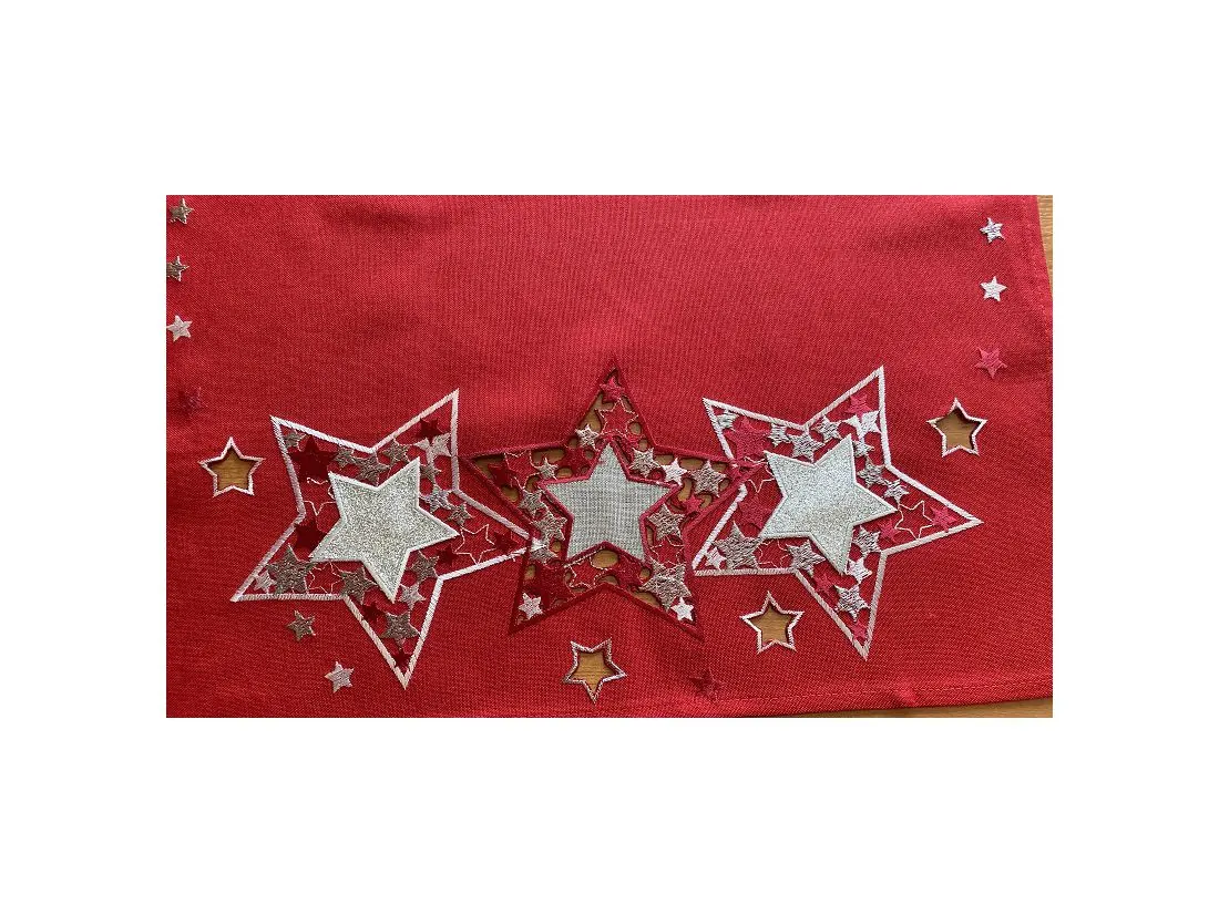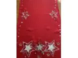 Bieżnik świąteczny w rozmiarze 40x180 cm w kolorze czerwonym , z bogato zdobioną aplikacja świąteczną czerwono srebrnymi gwiazdkami została wykonana na tkaninie 100 % poliestrowej, charakteryzuje się nowoczesnym designem, świątecznym wzorem oraz modnym kolorem. Aplikacja haftu gwiazdek na nakładce świątecznej jest w kolorze biało czerwonym przeplataną srebrną nitką.