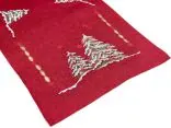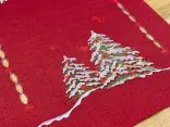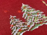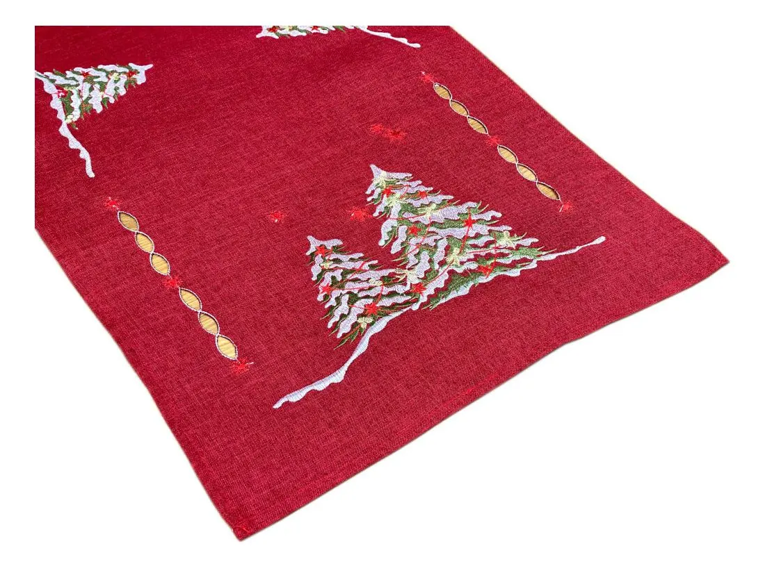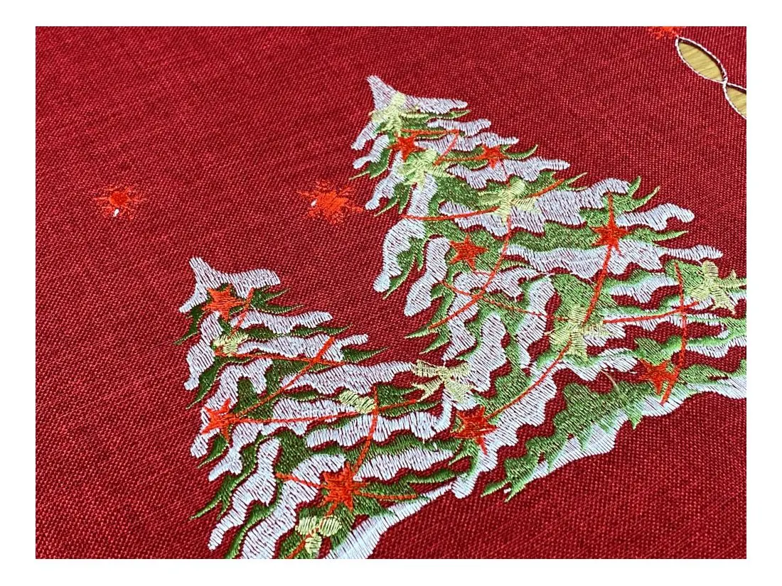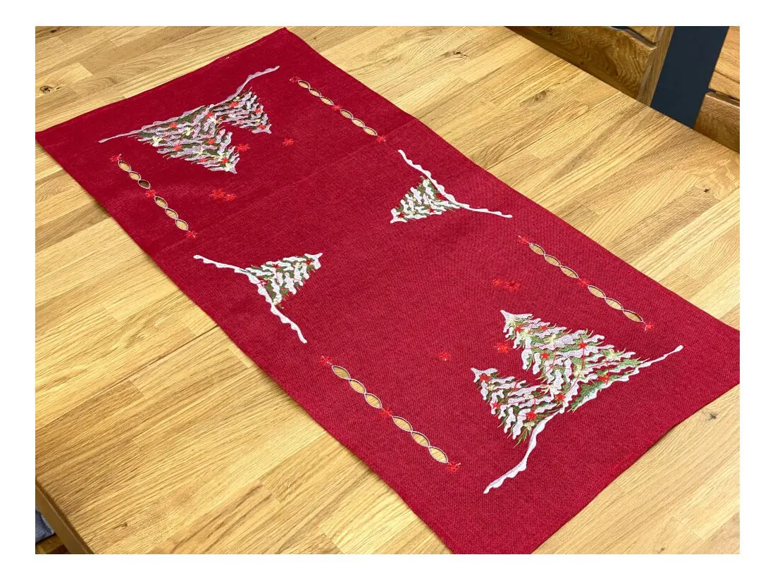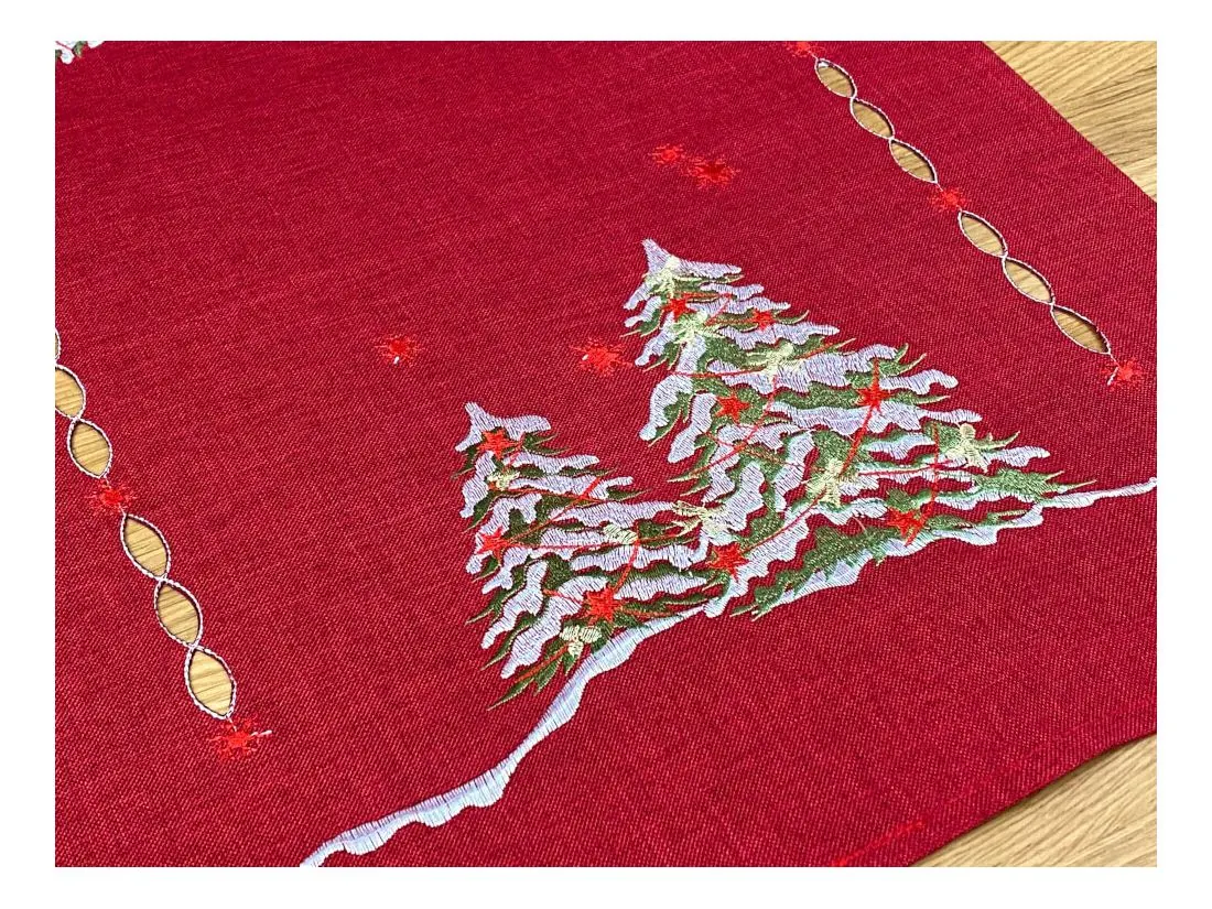Bieżnik świąteczny w rozmiarze 40x85 cm w kolorze czerwonym z bogato zdobioną aplikacją białej choinki została wykonana na tkaninie 100 % poliestrowej, charakteryzuje się nowoczesnym designem, świątecznym wzorem oraz modnym kolorem.