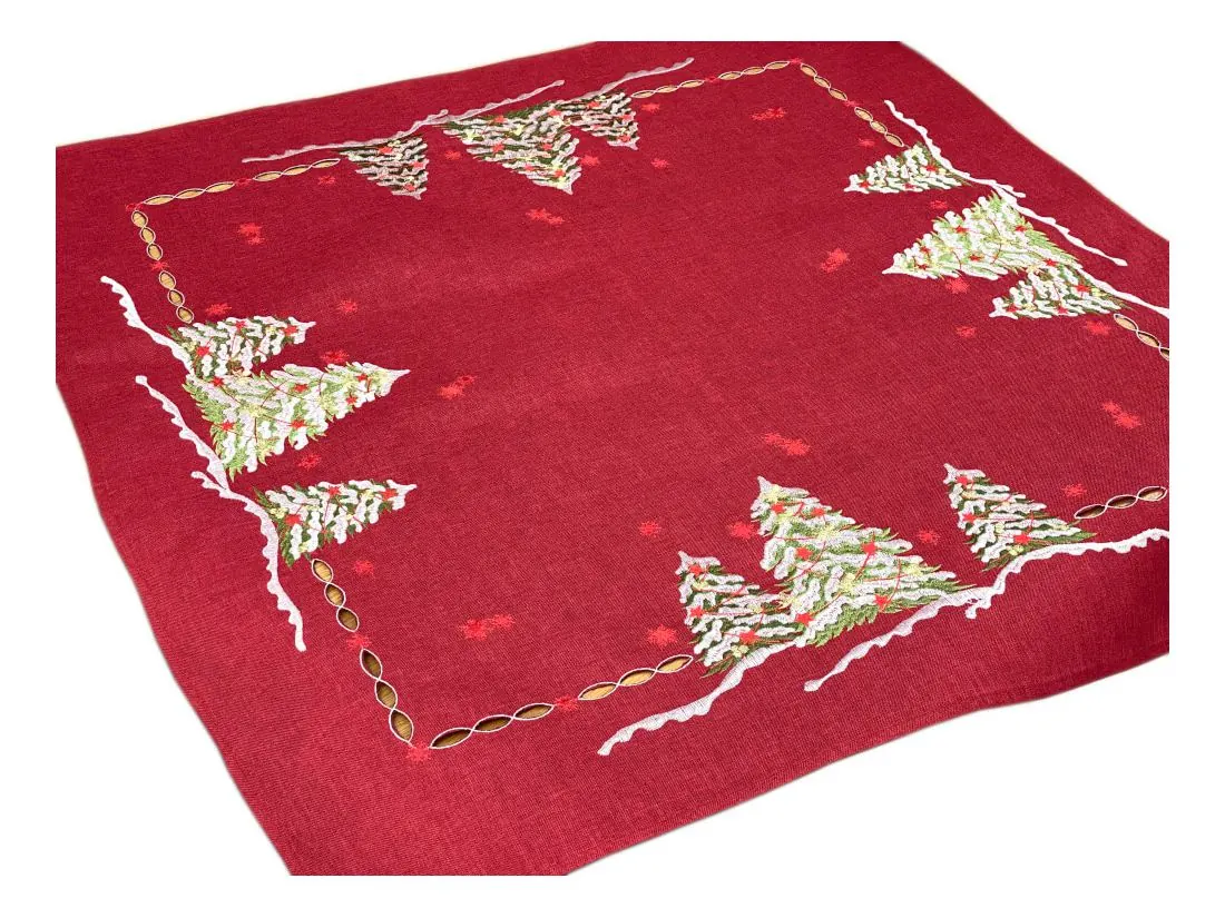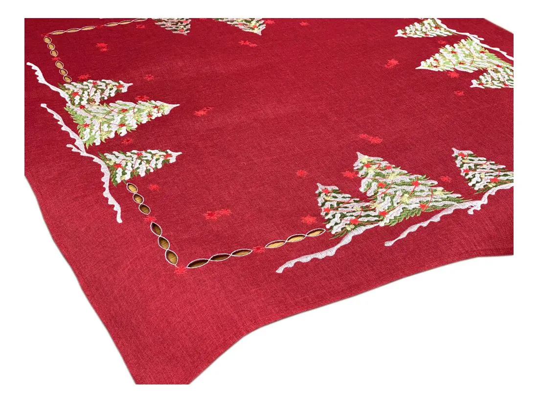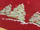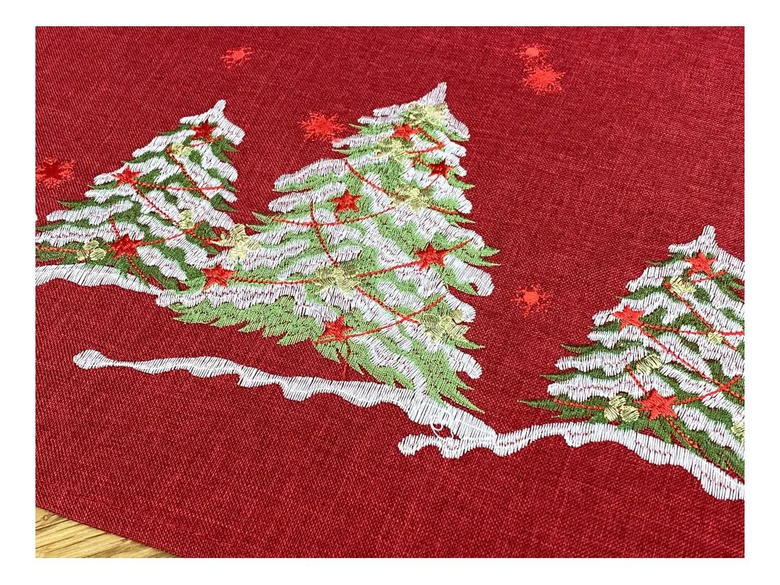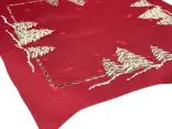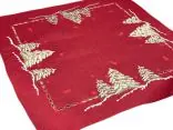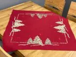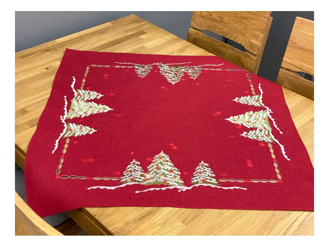 Bieżnik świąteczny w rozmiarze 85x85 cm w kolorze czerwonym z bogato zdobioną aplikacją białej choinki została wykonana na tkaninie 100 % poliestrowej, charakteryzuje się nowoczesnym designem, świątecznym wzorem oraz modnym kolorem.