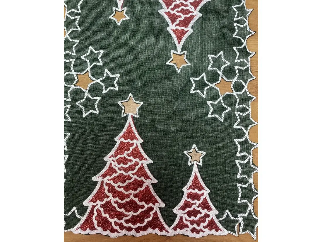 Bieżnik świąteczny w rozmiarze 30x40 cm w kolorze ciemno zielonym, z bogato zdobioną aplikacja świąteczną czerwono białą choinką została wykonana na tkaninie 100 % poliestrowej, charakteryzuje się nowoczesnym designem, świątecznym wzorem oraz modnym kolorem.