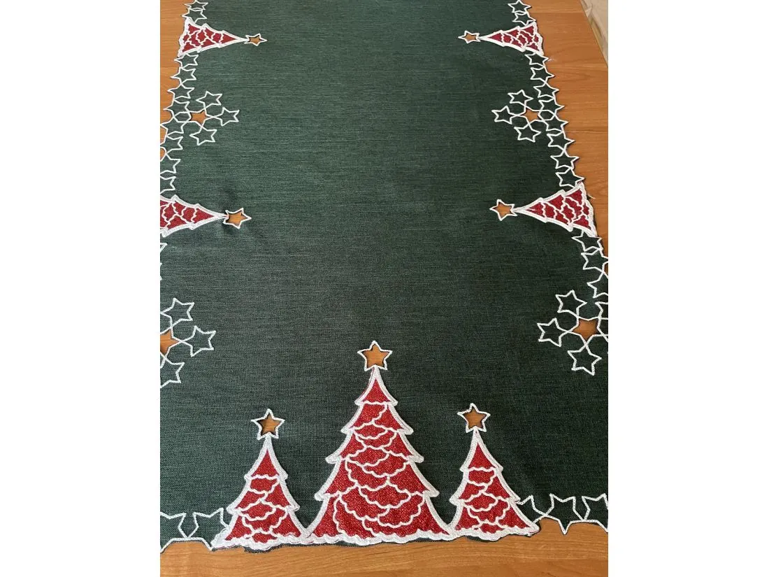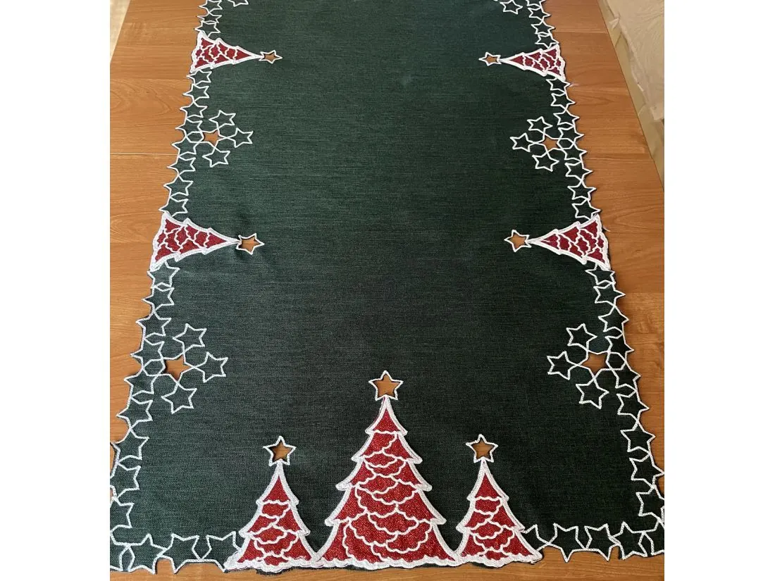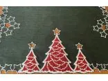Bieżnik świąteczny w rozmiarze 40x180 cm w kolorze ciemno zielonym, z bogato zdobioną aplikacja świąteczną czerwono białą choinką została wykonana na tkaninie 100 % poliestrowej, charakteryzuje się nowoczesnym designem, świątecznym wzorem oraz modnym kolorem.