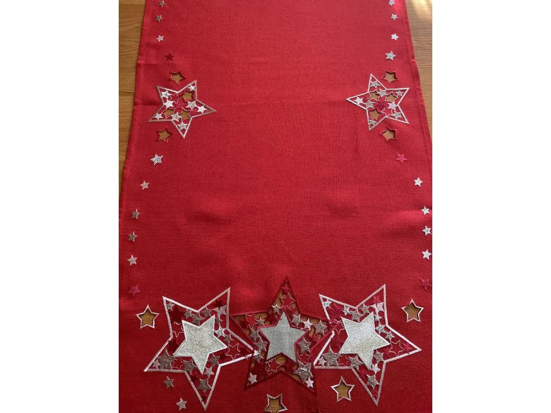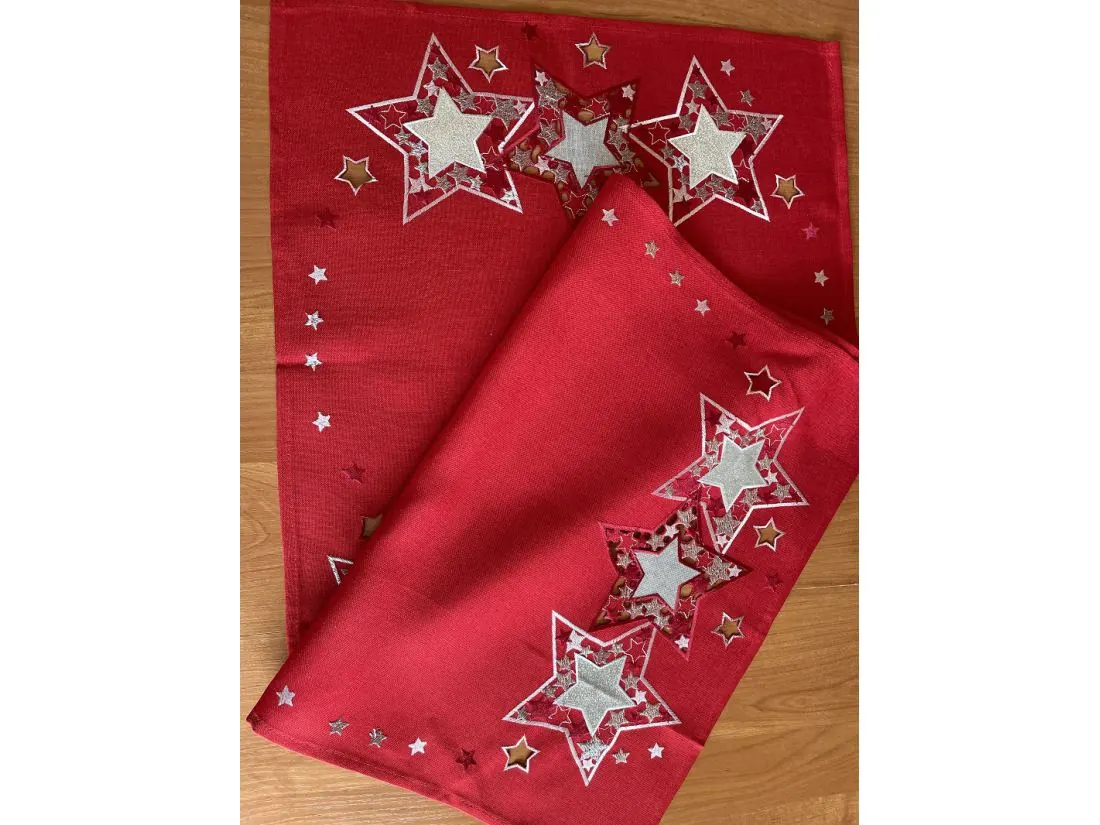 Bieżnik świąteczny w rozmiarze 40x140 cm w kolorze czerwonym , z bogato zdobioną aplikacja świąteczną czerwono srebrnymi gwiazdkami została wykonana na tkaninie 100 % poliestrowej, charakteryzuje się nowoczesnym designem, świątecznym wzorem oraz modnym kolorem. Aplikacja haftu gwiazdek na nakładce świątecznej jest w kolorze biało czerwonym przeplataną srebrną nitką.
