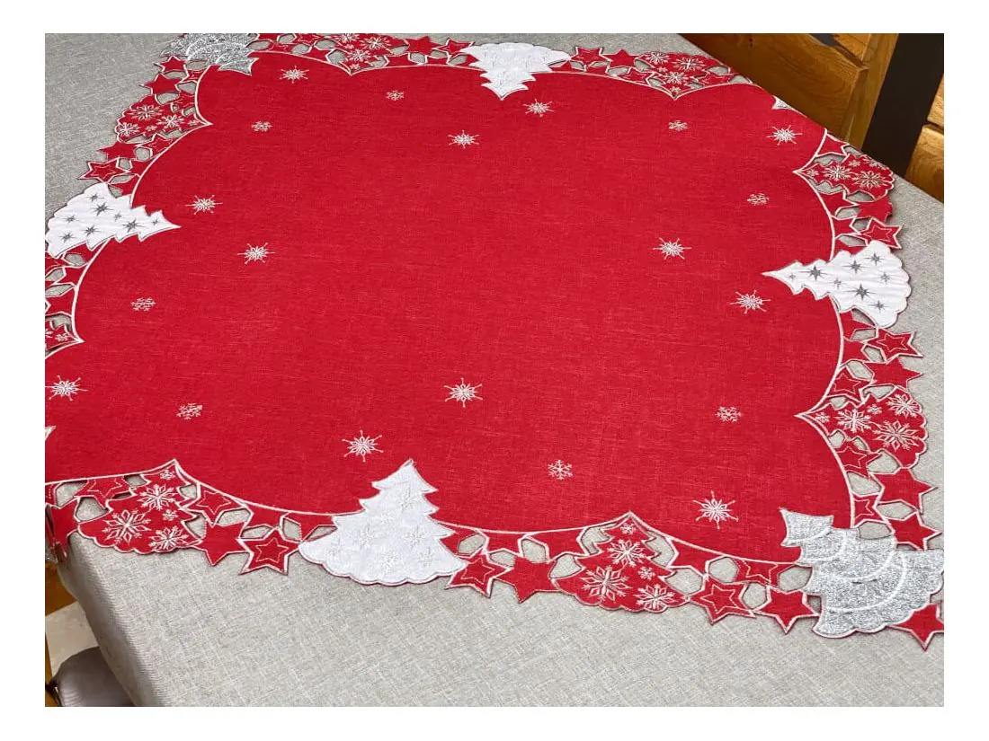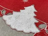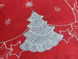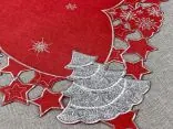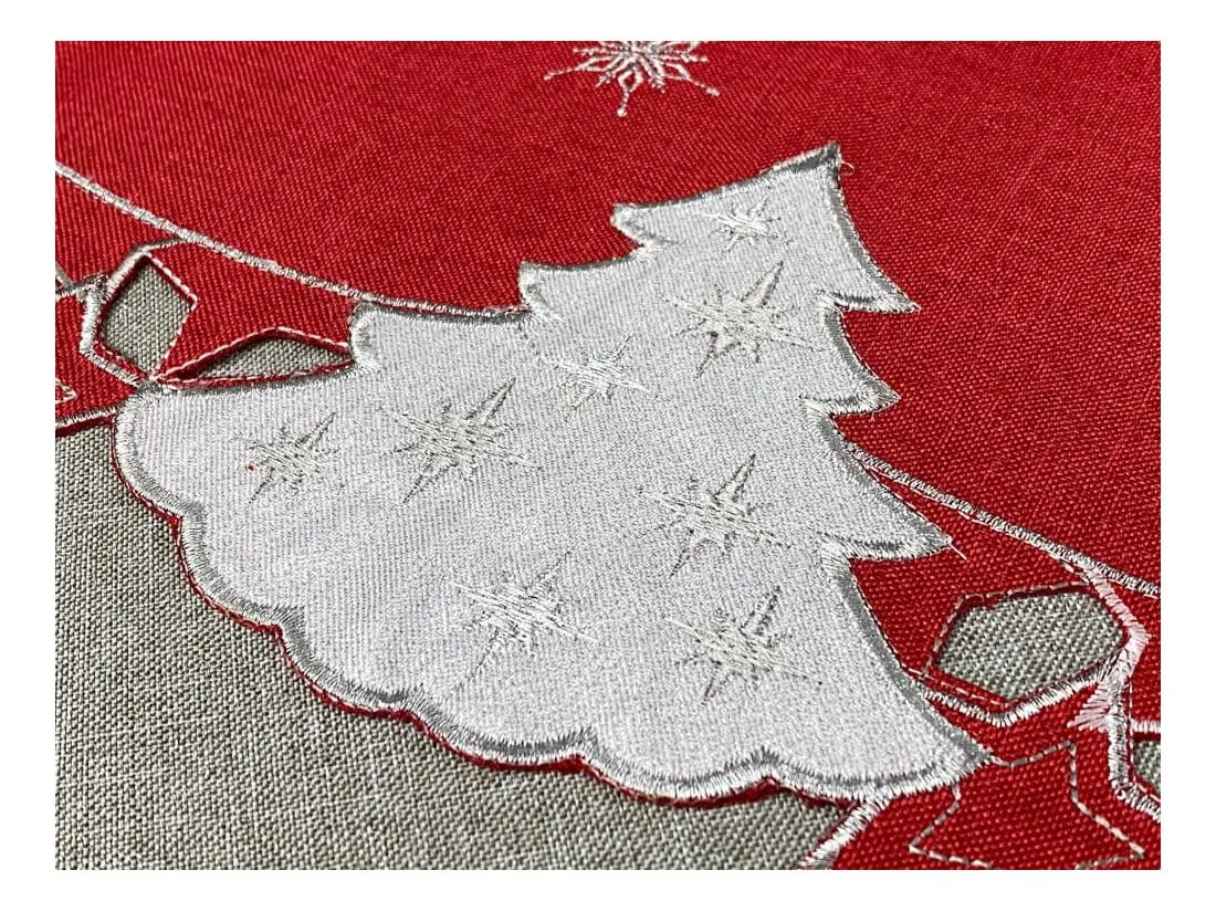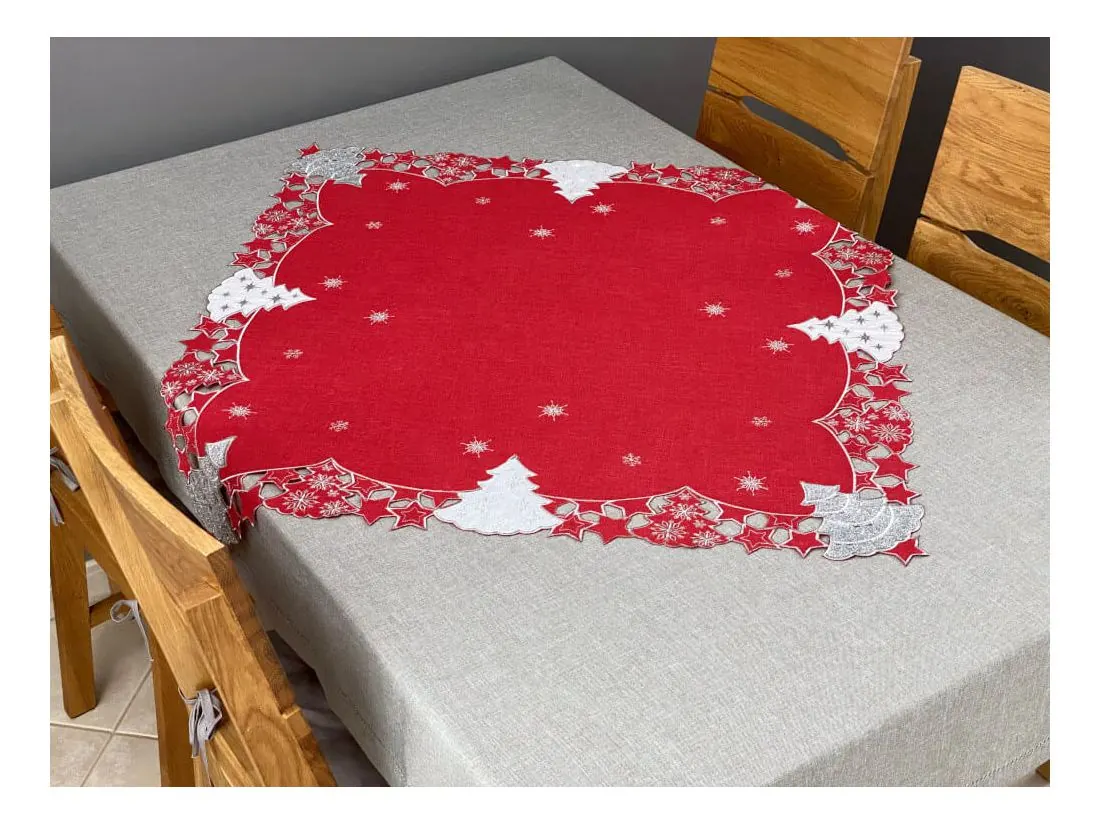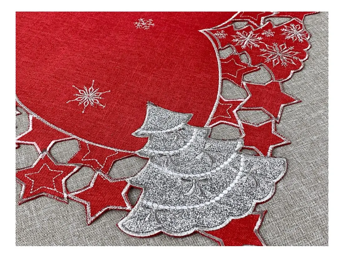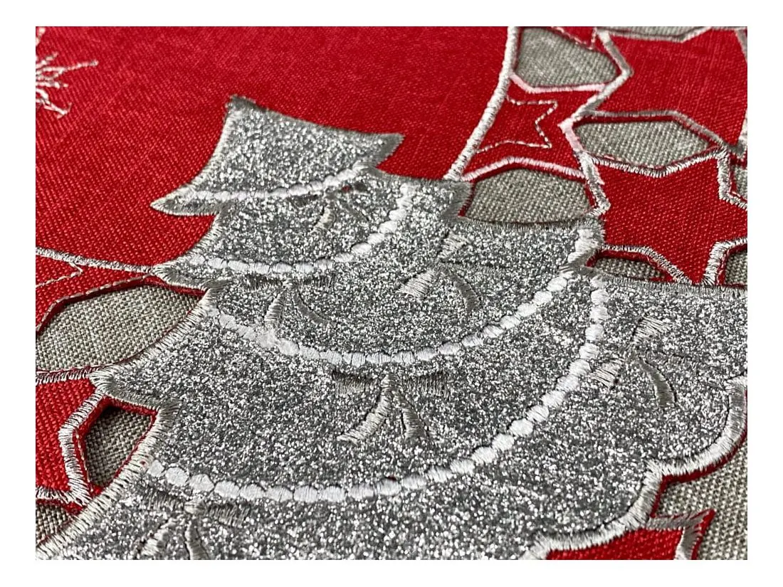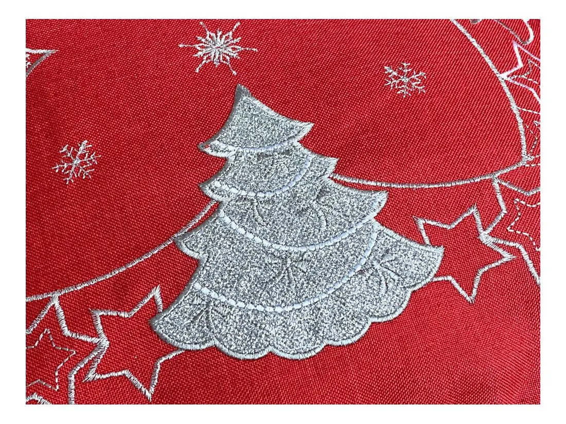 Bieżnik świąteczny w rozmiarze 85x85 cm w kolorze czerwono srebrnym z bogato zdobioną aplikacją srebrnych gwiazdek i choinek została wykonana na tkaninie 100 % poliestrowej, charakteryzuje się nowoczesnym designem, świątecznym wzorem oraz modnym kolorem. Brzegi nakładki otacza wycinany i haftowany gwiezdny pas.