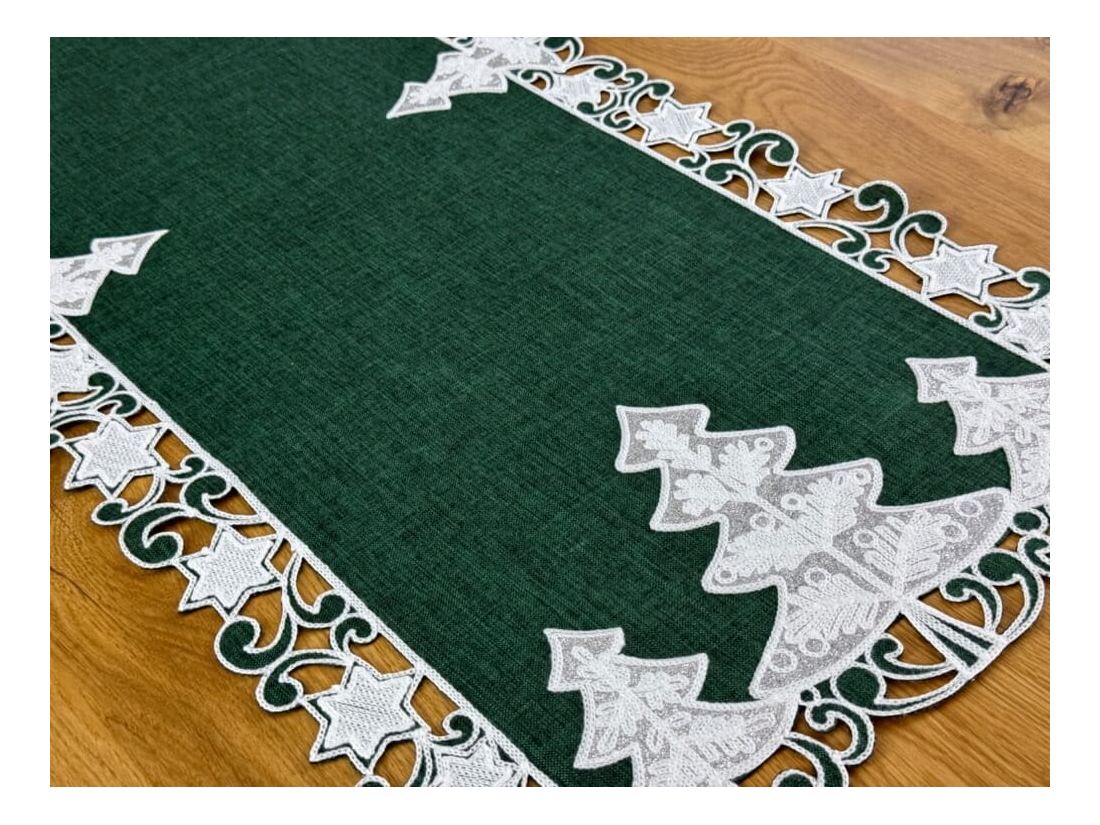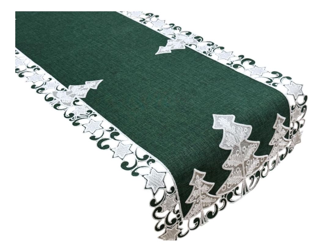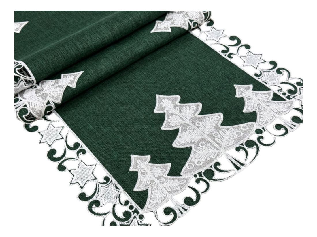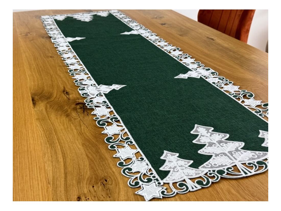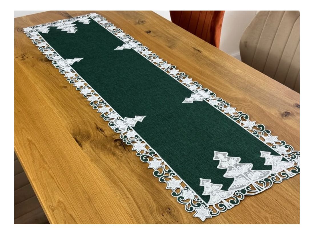 Bieżnik wyróżnia się głębokim, intensywnie zielonym kolorem, symbolizującym świąteczną radość i ciepło rodzinnych chwil. Centralnym motywem dekoracyjnym są aplikacje w kształcie choinek, które pięknie połyskują srebrzystymi refleksami, przyciągając wzrok i dodając blasku każdemu wnętrzu. Dzięki srebrnym akcentom, bieżnik prezentuje się elegancko zarówno w świetle dziennym, jak i przy wieczornym oświetleniu, stając się idealnym tłem dla bożonarodzeniowej zastawy i świec.