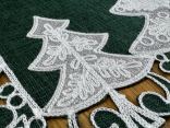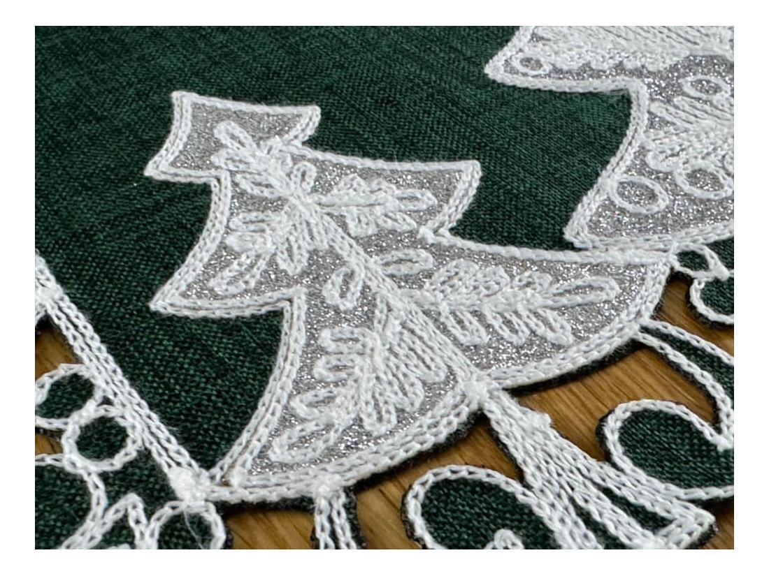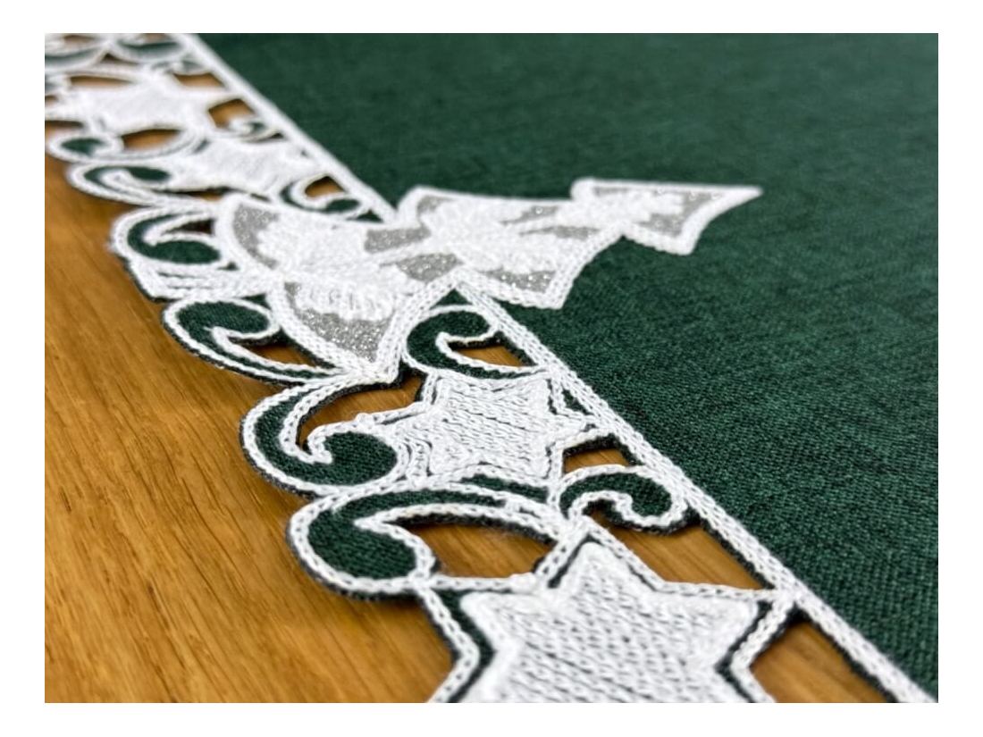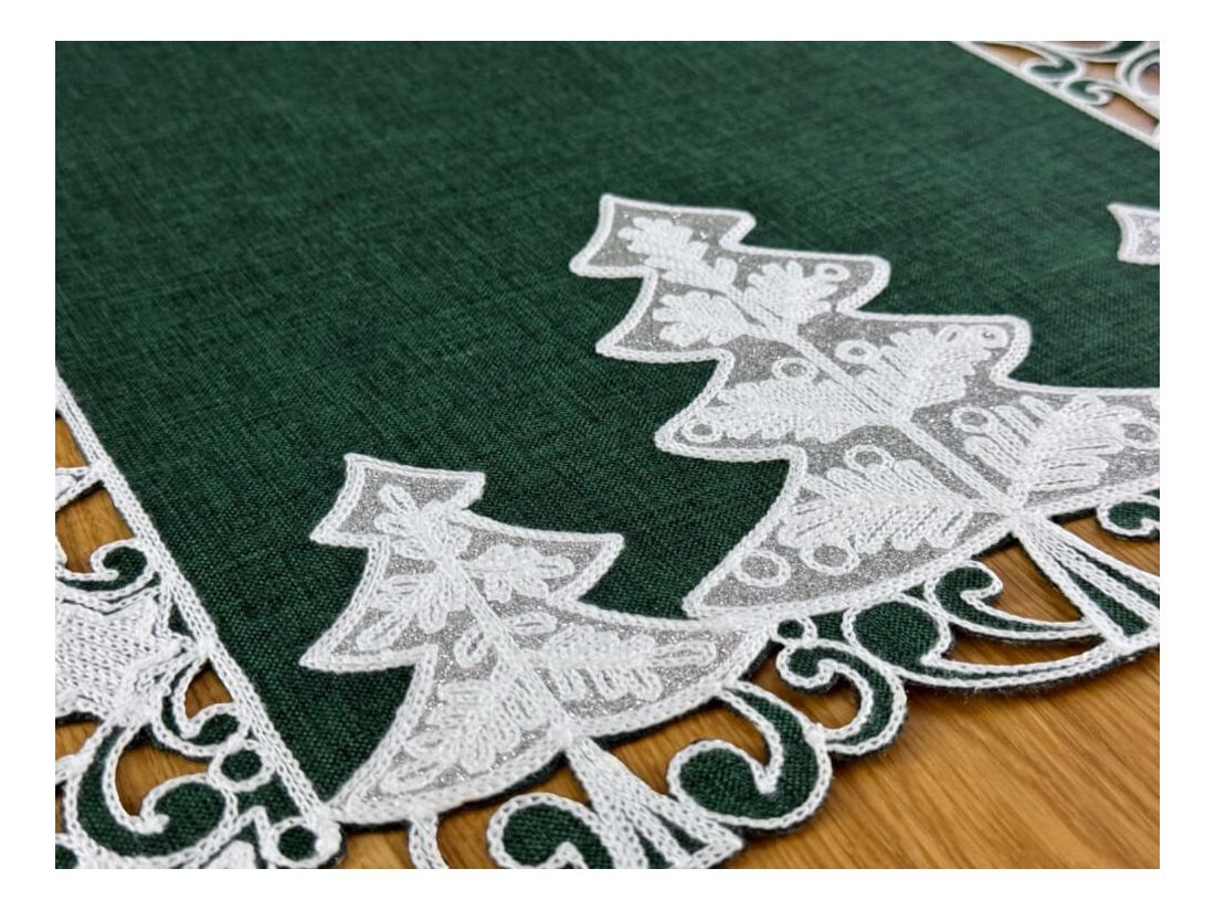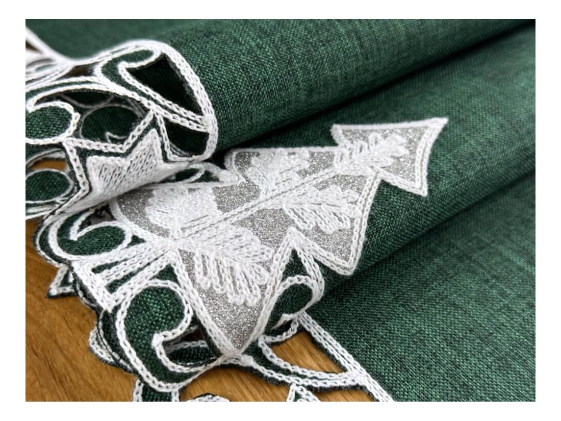 Wykończenie bieżnika to prawdziwe arcydzieło – ozdobny haft łańcuszkowy inspirowany zimową aurą dodaje mu uroku i dbałości o detale. Brzegi bieżnika zdobią starannie wykonane haftowane gwiazdki oraz choinki, które podkreślają zimowy i świąteczny klimat dekoracji.