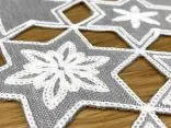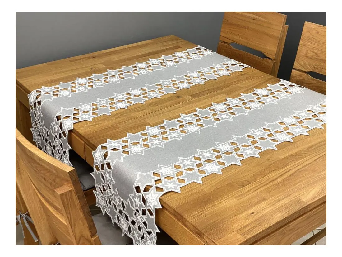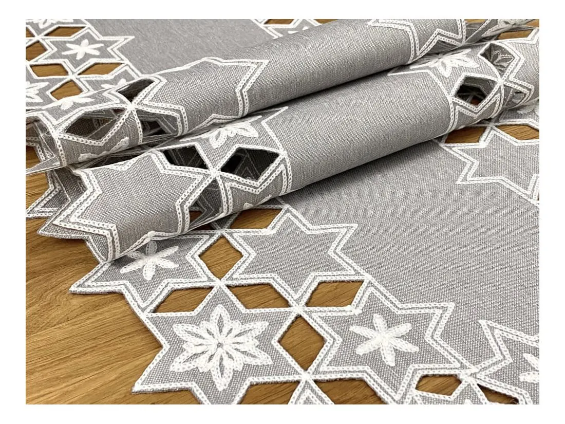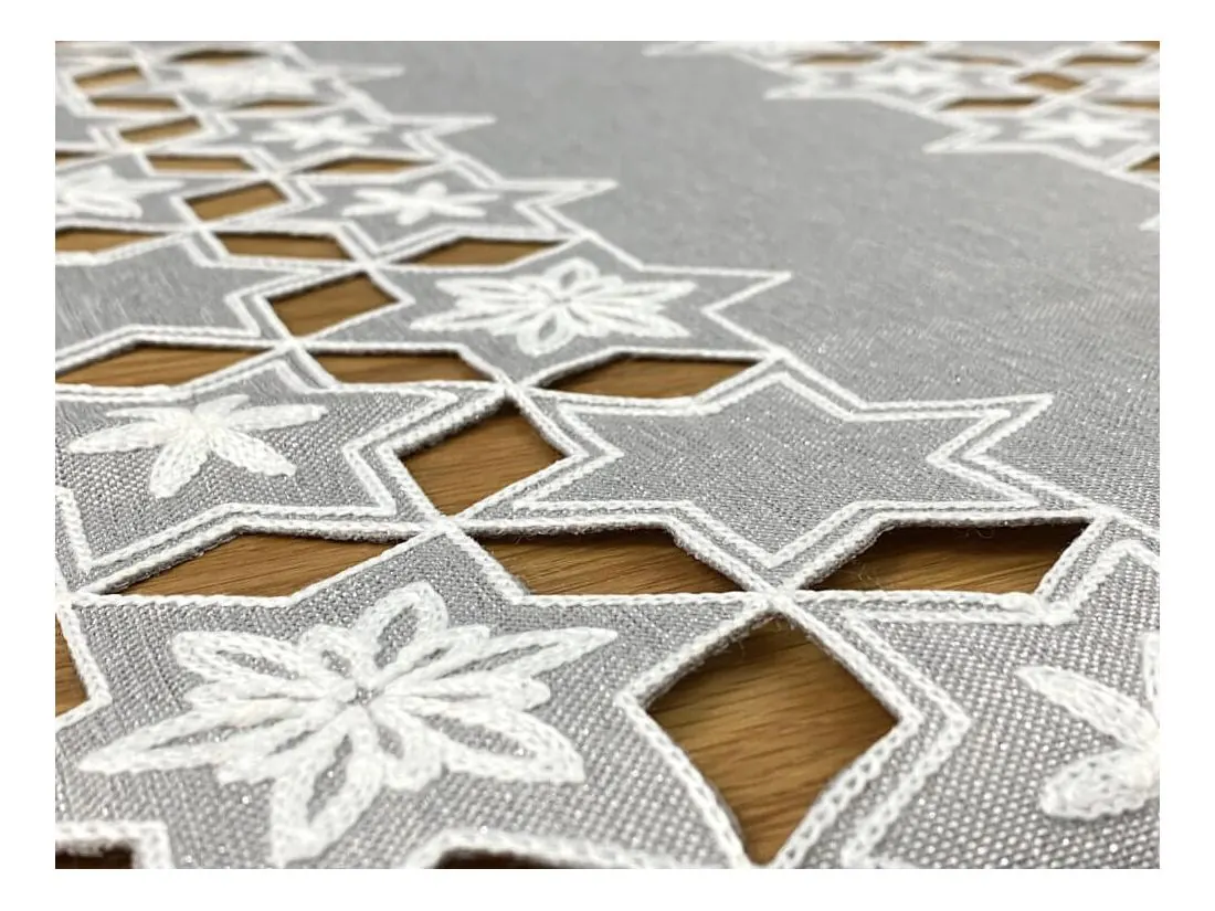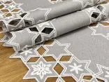 Bieżnik świąteczny w rozmiarze 40x140 cm w kolorze szarym z bogato zdobioną aplikacją połączonych białych gwiazdek haftowaną metoda łańcuszkową została wykonana na tkaninie lurex 100 % poliestrowej, charakteryzuje się nowoczesnym designem, świątecznym wzorem oraz modnym kolorem. Dzięki srebrnym niciom w strukturze, tkanina lurex połyskuje.