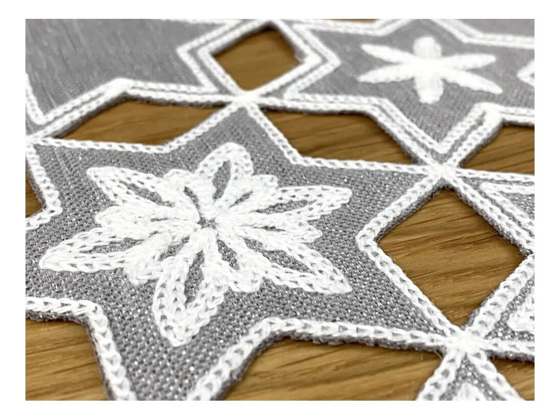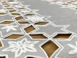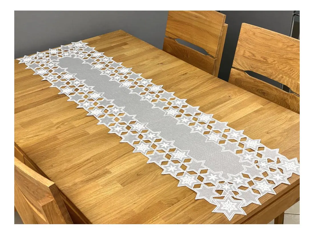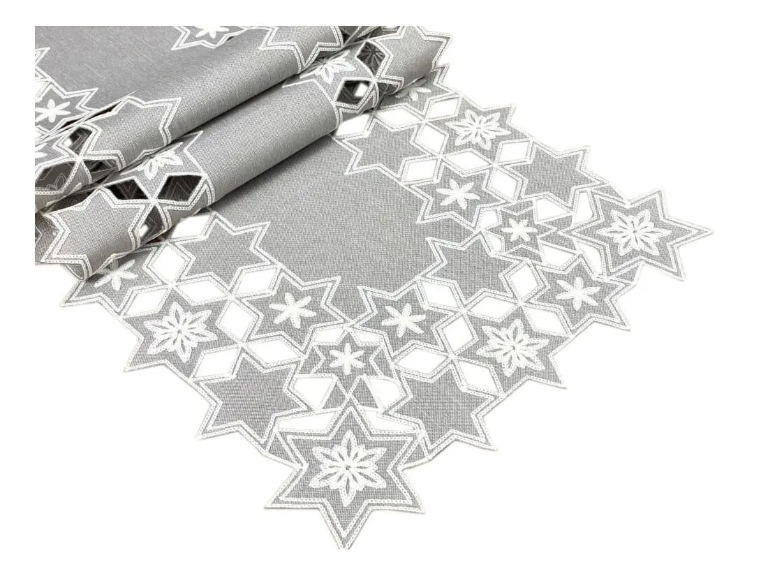 Bieżnik świąteczny w rozmiarze 40x174 cm w kolorze szarym z bogato zdobioną aplikacją połączonych białych gwiazdek haftowaną metoda łańcuszkową została wykonana na tkaninie lurex 100 % poliestrowej, charakteryzuje się nowoczesnym designem, świątecznym wzorem oraz modnym kolorem. Dzięki srebrnym niciom w strukturze, tkanina lurex połyskuje.