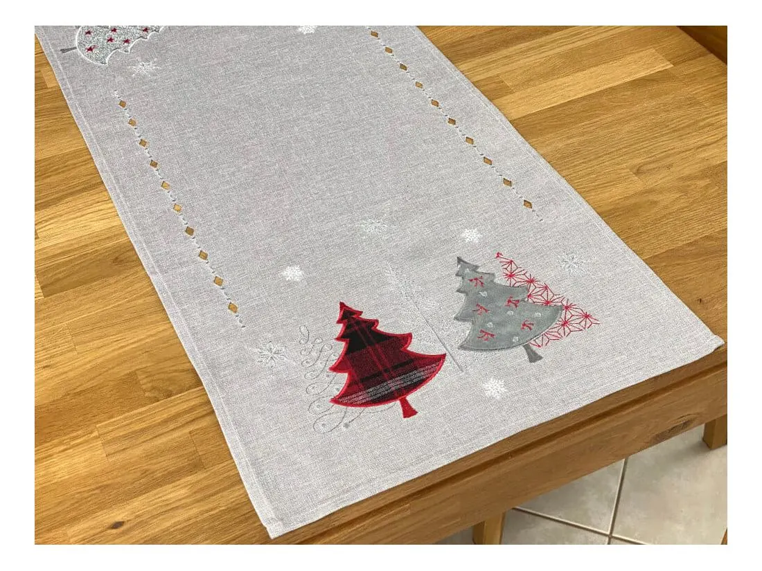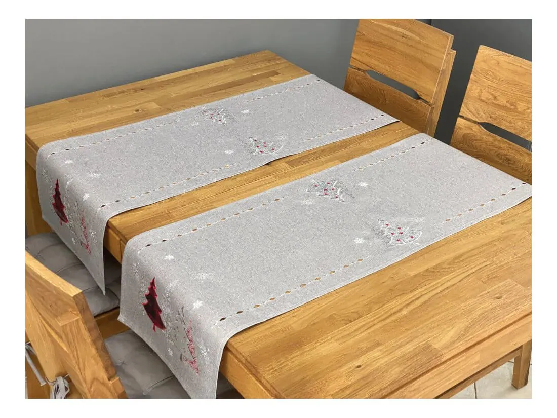 Bieżnik świąteczny w rozmiarze 40x174 cm w kolorze szarym z bogato zdobioną aplikacją czerwono srebrnych choinek, została wykonana na tkaninie lurex 100 % poliestrowej, charakteryzuje się nowoczesnym designem, świątecznym wzorem oraz modnym kolorem. Czerwona naszyta choinka jest z tkaniny w kratkę, srebrna choinka z miękkiego weluru. Dodatkową ozdobą nakładki są wycięcia wzdłuż bieżnika w formie łańcuszka. Dzięki zastosowanym srebrnym niciom w strukturze, tkanina lurex połyskuje.