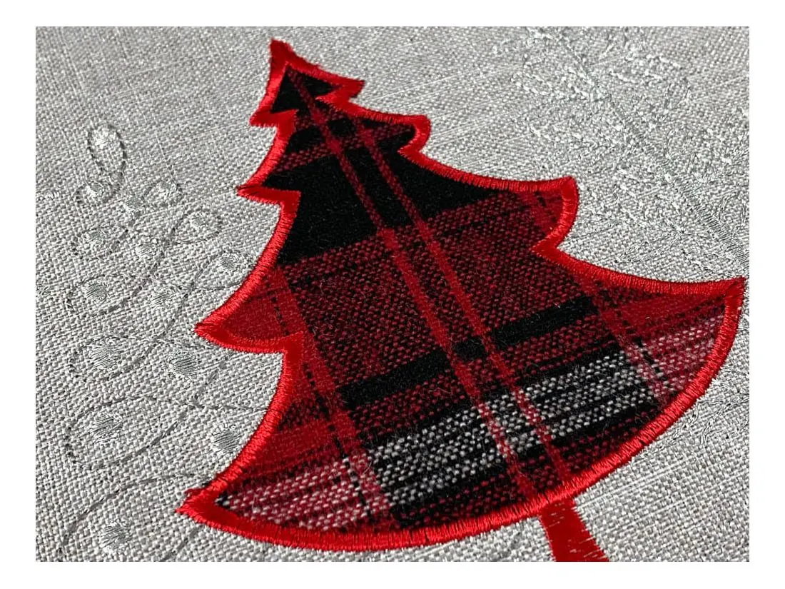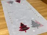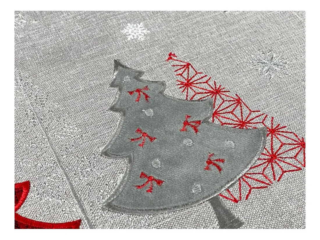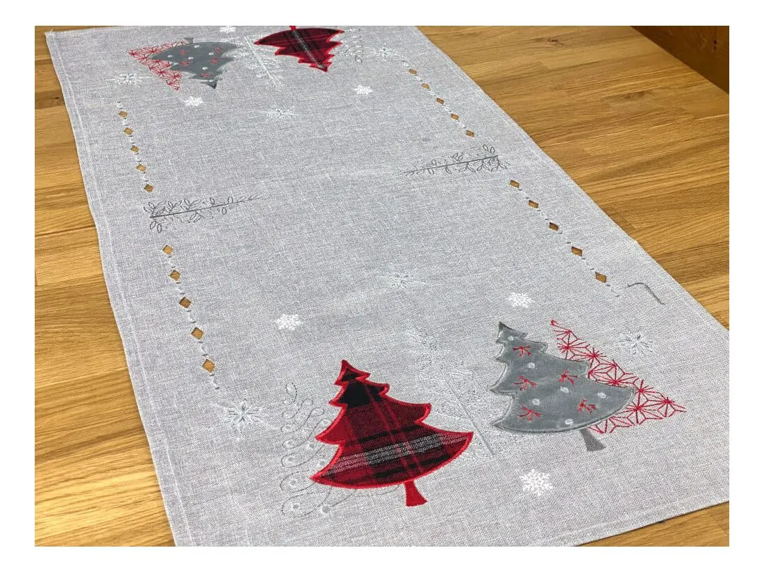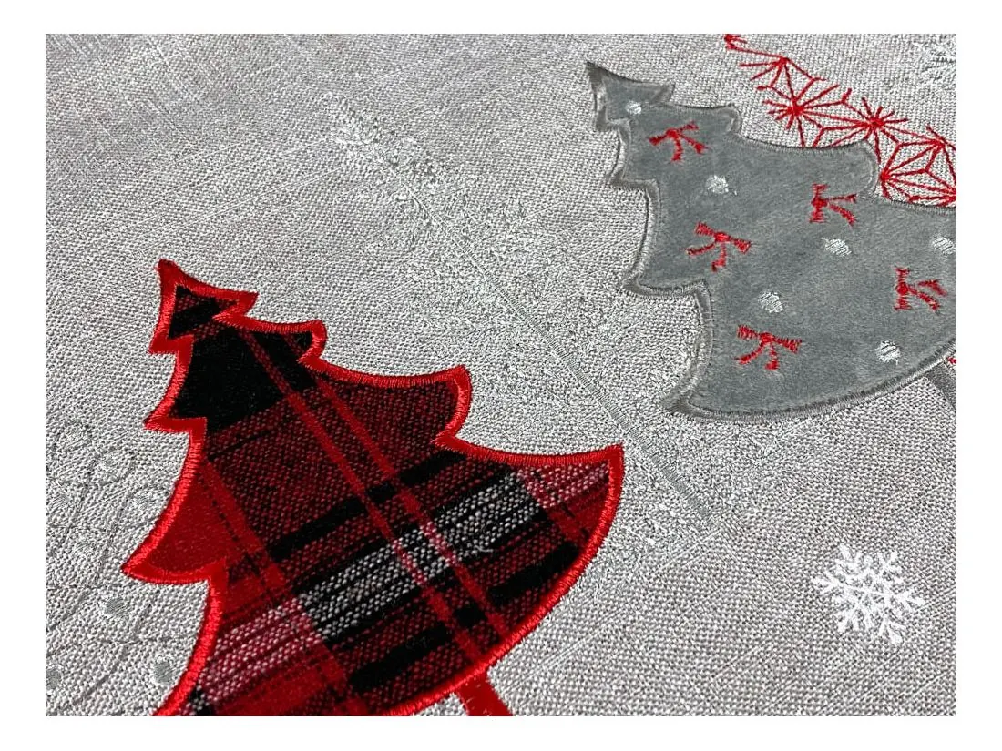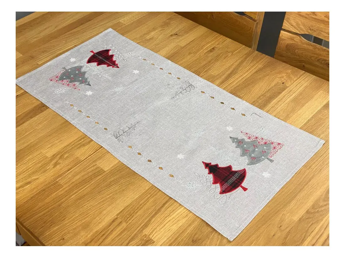 Bieżnik świąteczny w rozmiarze 50x100 cm w kolorze szarym z bogato zdobioną aplikacją czerwono srebrnych choinek, została wykonana na tkaninie lurex 100 % poliestrowej, charakteryzuje się nowoczesnym designem, świątecznym wzorem oraz modnym kolorem. Czerwona naszyta choinka jest z tkaniny w kratkę, srebrna choinka z miękkiego weluru. Dodatkową ozdobą nakładki są wycięcia wzdłuż bieżnika w formie łańcuszka. Dzięki zastosowanym srebrnym niciom w strukturze, tkanina lurex połyskuje.