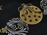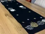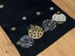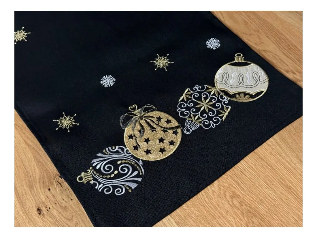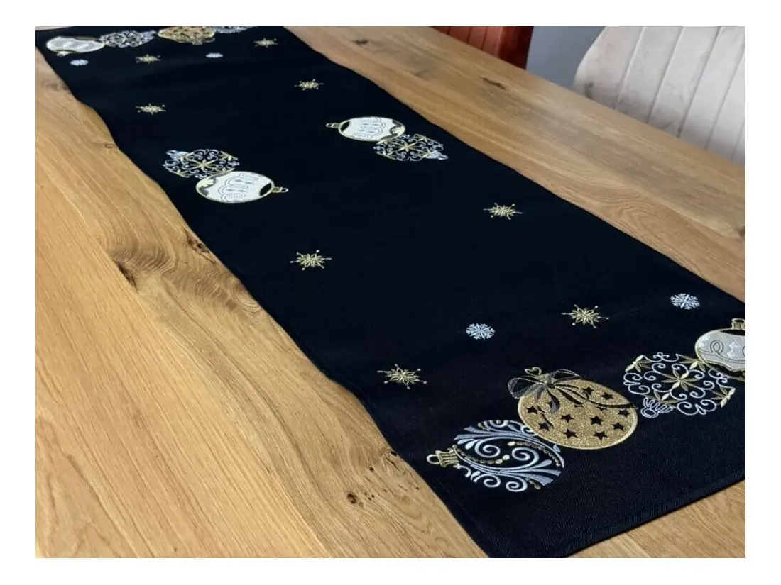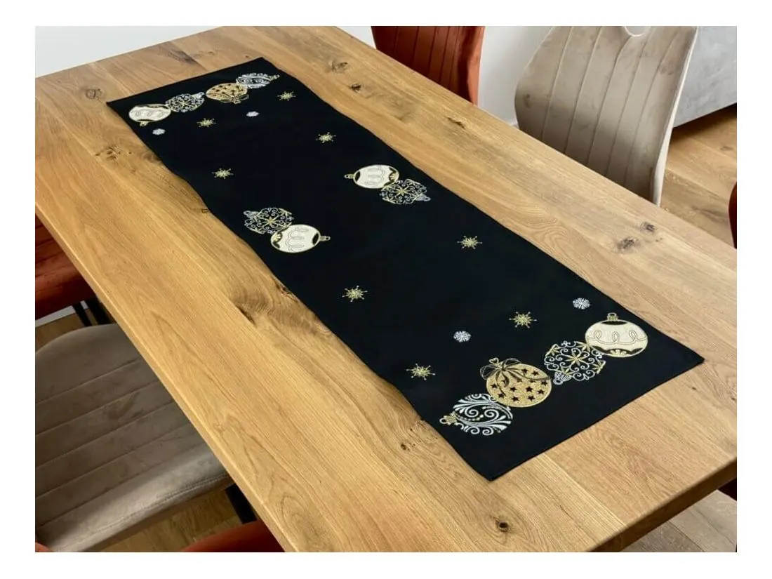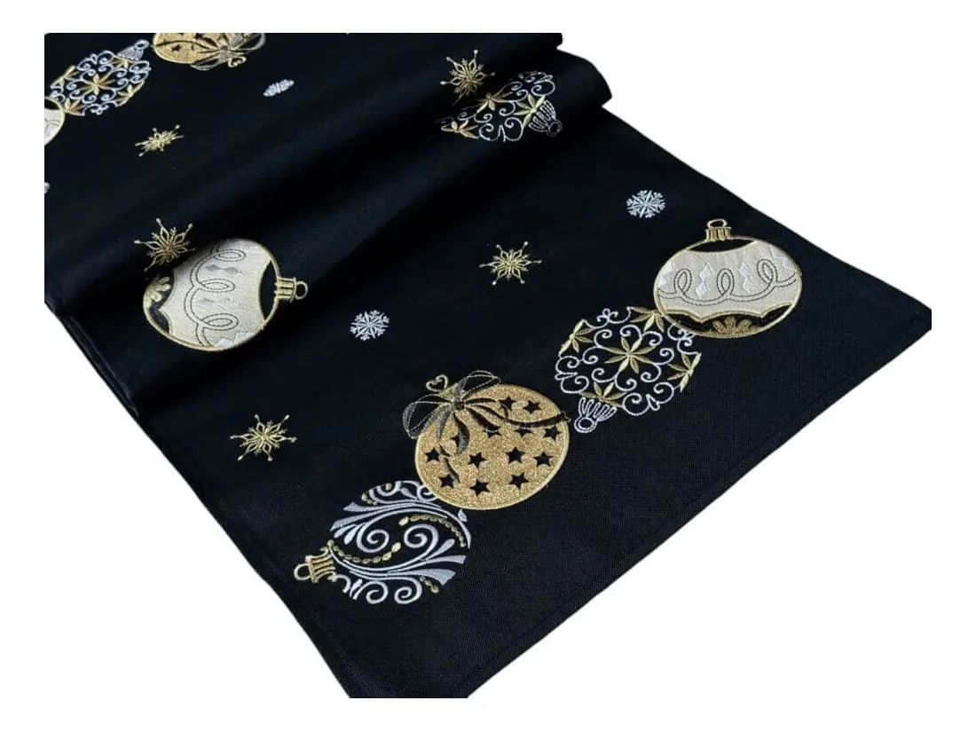 Bieżnik świąteczny wykonany z wysokiej jakości poliestru (100%) w klasycznym, czarnym kolorze, który wprowadza elegancję do świątecznego wystroju wnętrza. Złote, haftowane bombki tworzą wyrafinowany i nowoczesny wzór, dodając stylu i blasku każdemu stołowi.