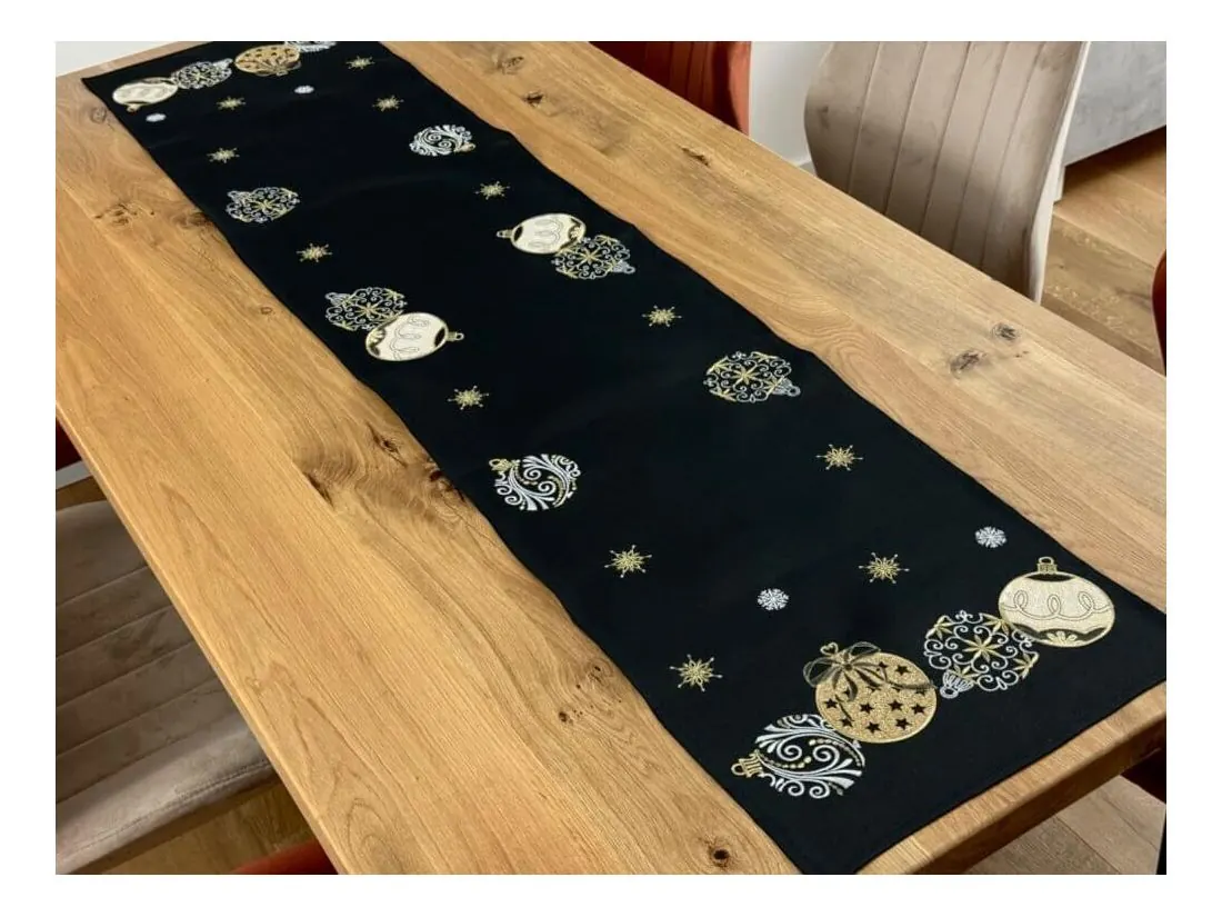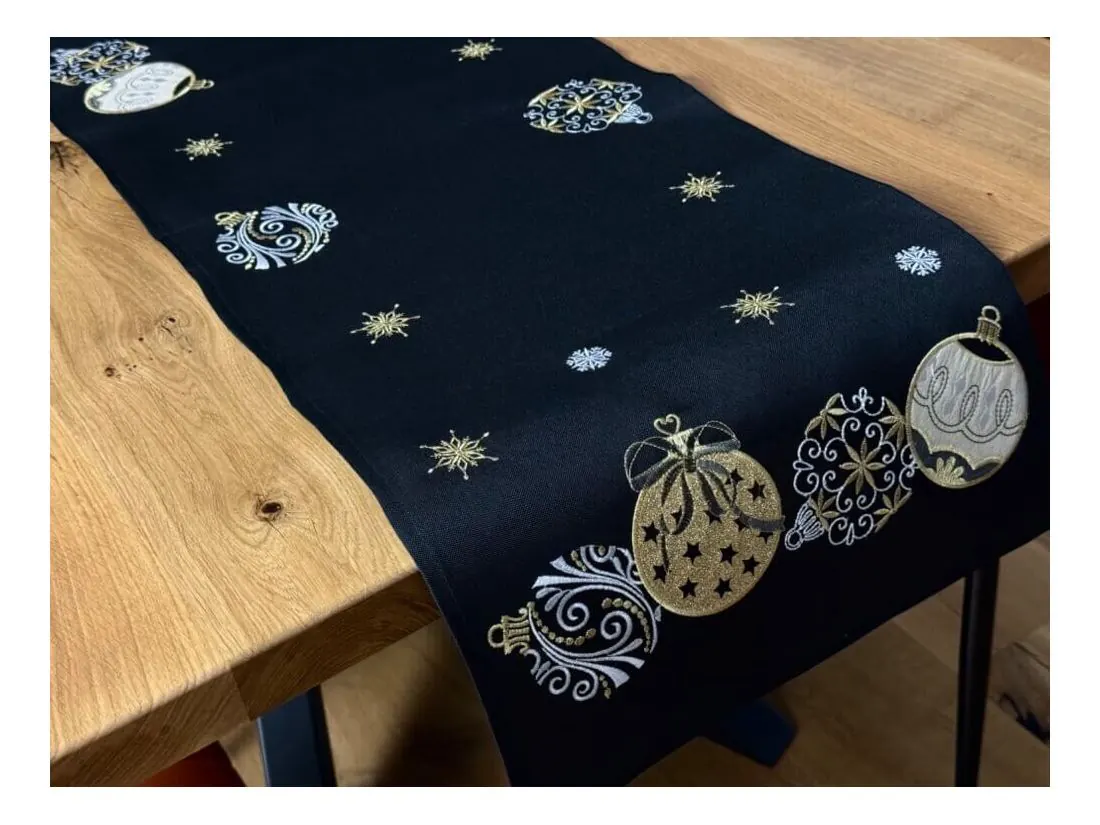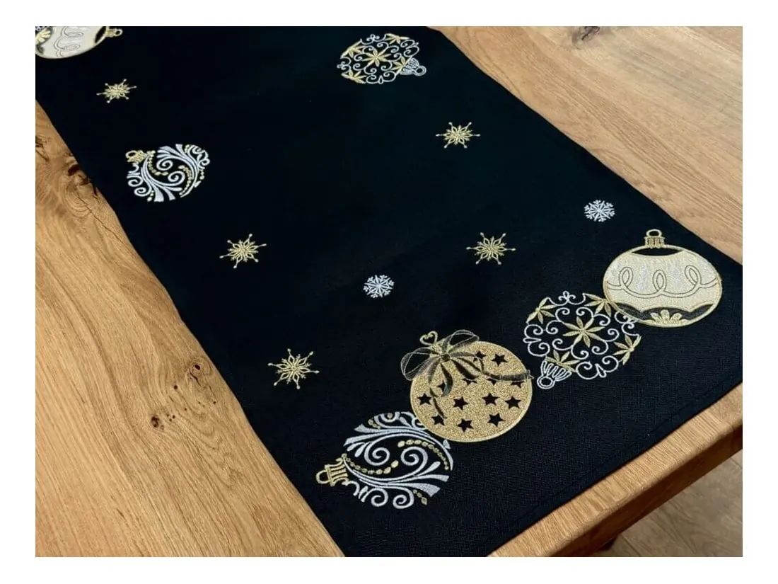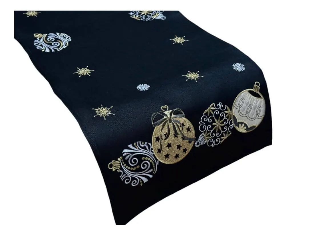 Bieżnik świąteczny wykonany z wysokiej jakości poliestru (100%) w klasycznym, czarnym kolorze, który wprowadza elegancję do świątecznego wystroju wnętrza. Złote, haftowane bombki tworzą wyrafinowany i nowoczesny wzór, dodając stylu i blasku każdemu stołowi.