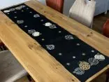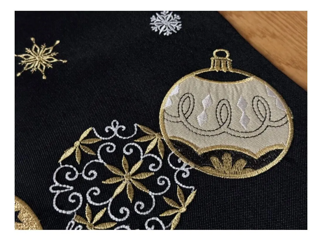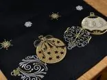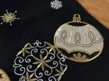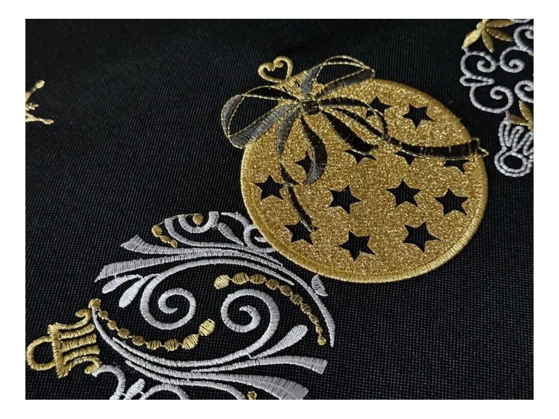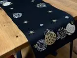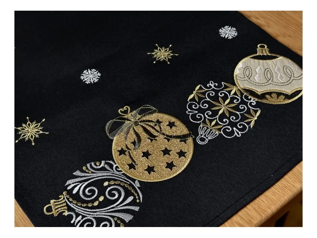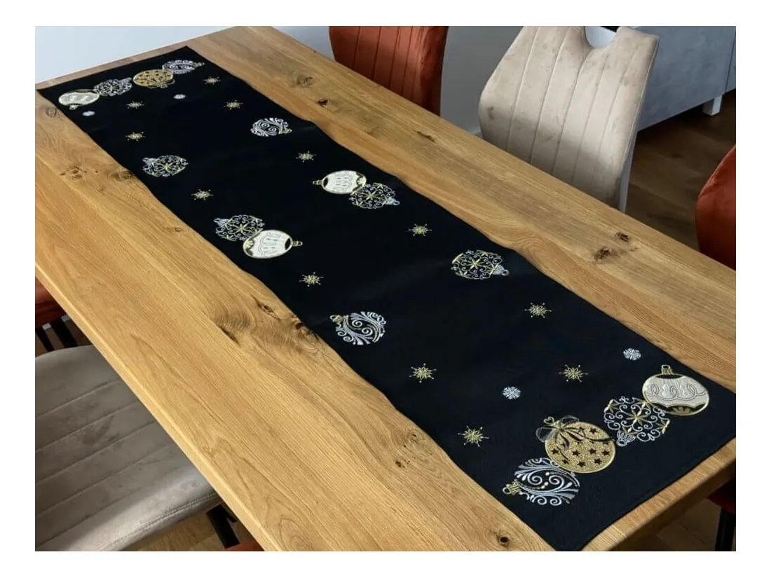 Bieżnik świąteczny wykonany z wysokiej jakości poliestru (100%) w klasycznym, czarnym kolorze, który wprowadza elegancję do świątecznego wystroju wnętrza. Złote, haftowane bombki tworzą wyrafinowany i nowoczesny wzór, dodając stylu i blasku każdemu stołowi.