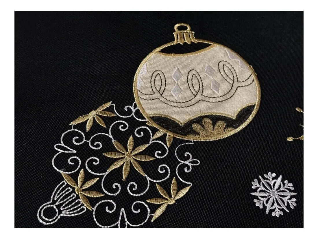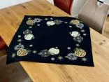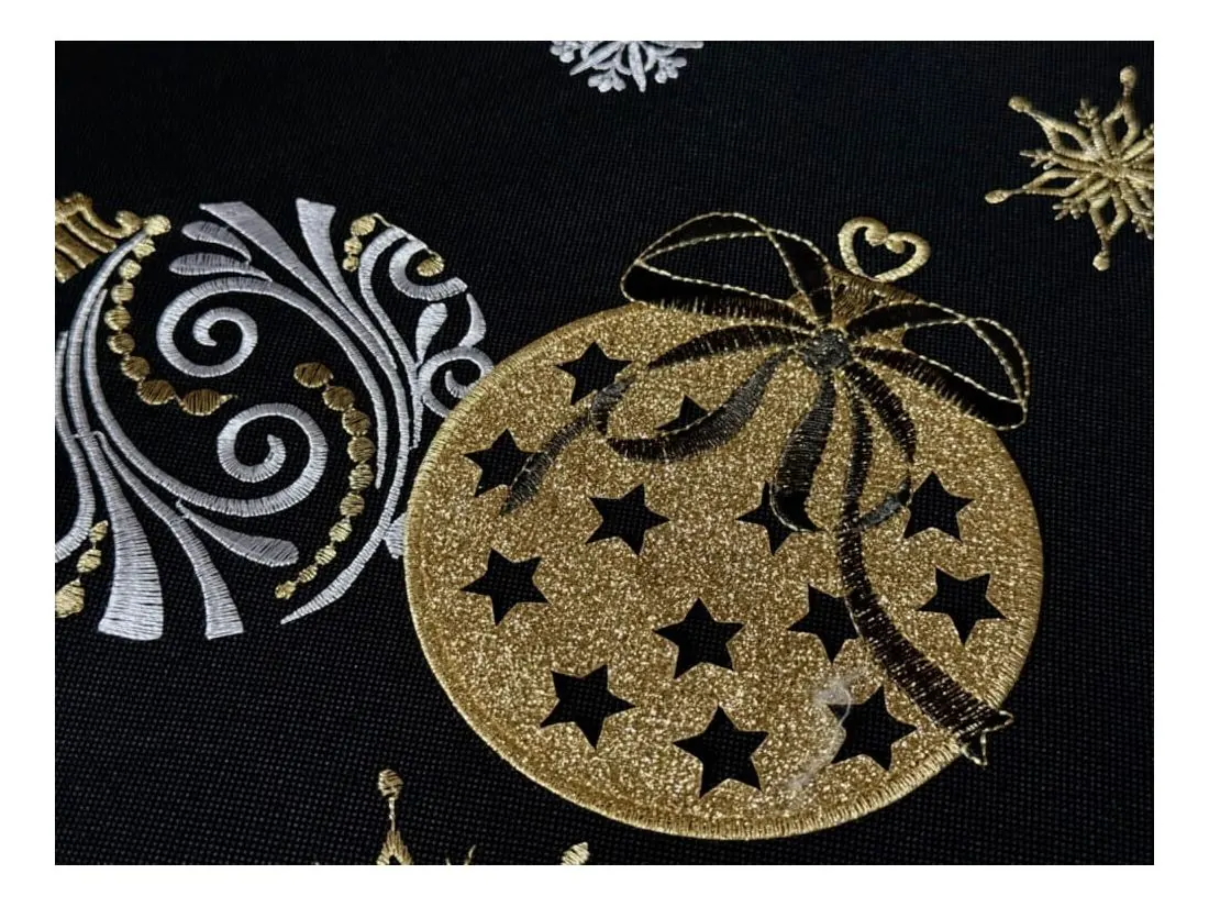 Bieżnik świąteczny wykonany z wysokiej jakości poliestru (100%) w klasycznym, czarnym kolorze, który wprowadza elegancję do świątecznego wystroju wnętrza. Złote, haftowane bombki tworzą wyrafinowany i nowoczesny wzór, dodając stylu i blasku każdemu stołowi.