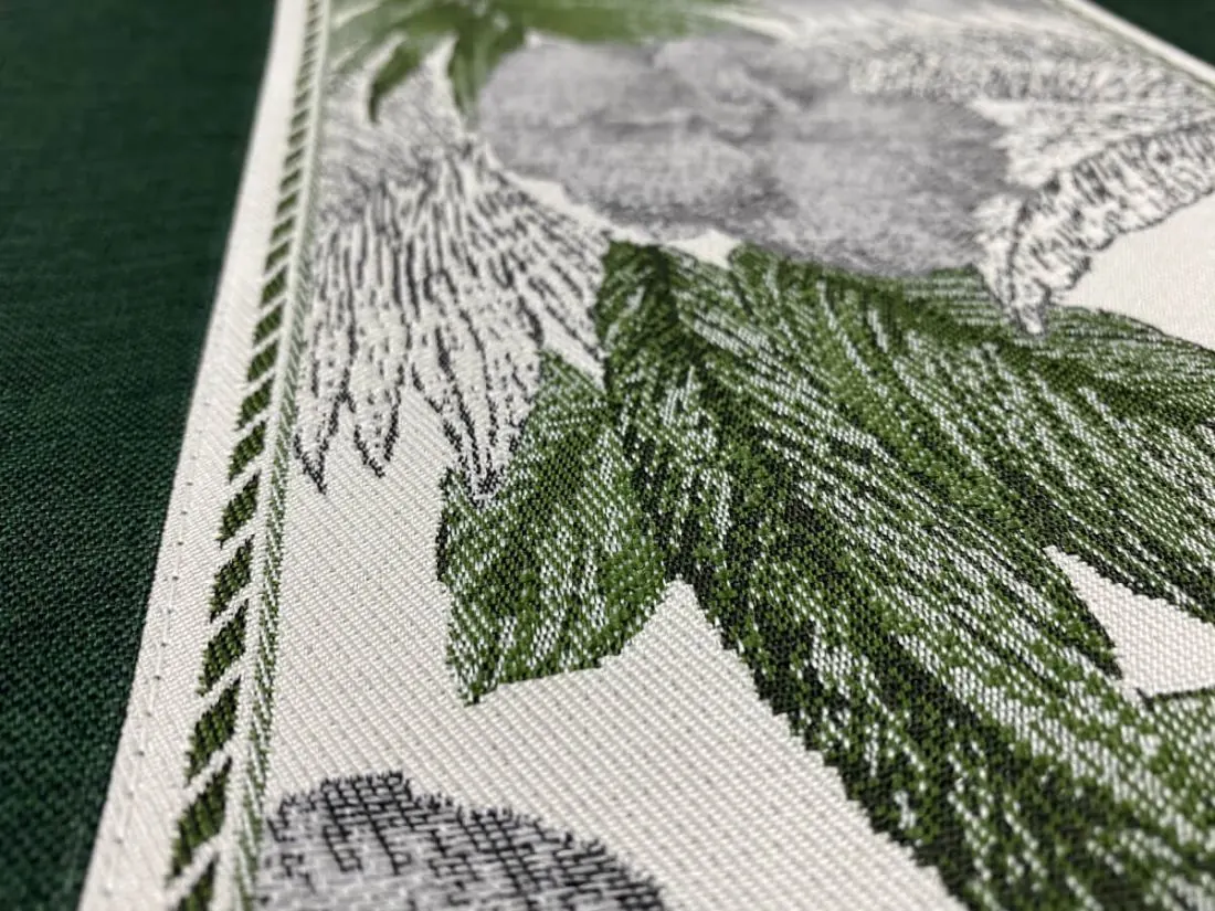 Dekoracyjny bieżnik w rozmiarze 40x90 cm z żakardową aplikacją w kolorze zielonym.