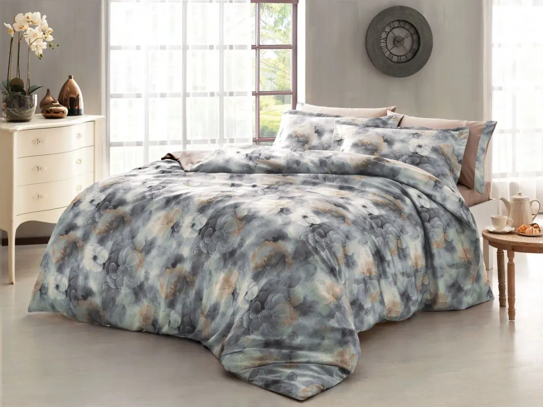 Ekskluzywna pościel satynowa Bryant Caffe 200x220 Tivolyo Wrinkle kwiatki
