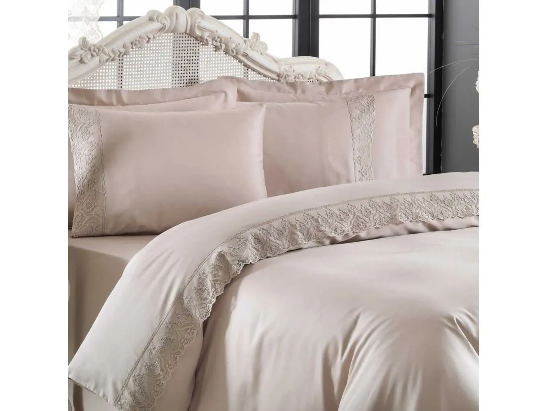 Ekskluzywny komplet pościel z kolekcji Guipure został wykonany z najwyższej jakości 100 % bawełny o gęstym satynowym splocie jest miły i delikatny w dotyku. Efektowne dekoracyjne doszycia delikatnej koronki na pościeli sprawiają, że pościel nada wyrafinowany elegancki wygląd naszej sypialni. Subtelne wzornictwo oraz stonowana kolorystyka pozwoli dobrać komplet pościeli do każdej sypialni nadając jej niepowtarzalnego eleganckiego uroku.