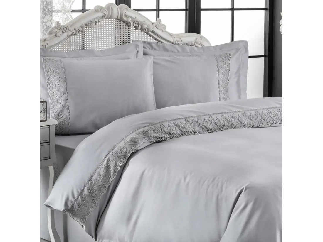 Luksusowa pościel z koronką 6 elementowa wzór Lina Grey w rozmiarze 200 X 220 cm firmy TIVOLYO HOME z kolekcji Guipure, to ekskluzywna pościel dla każdego kto w swojej sypialni ceni luksus i elegancje.