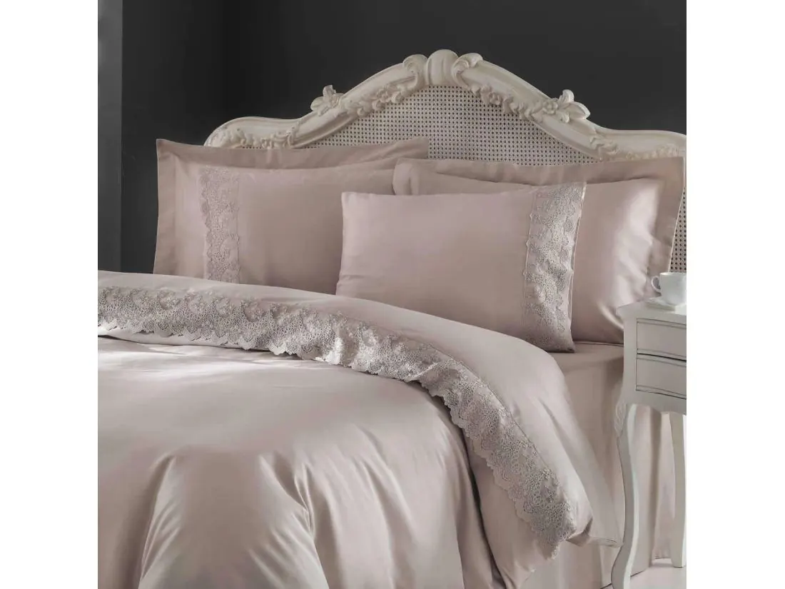 Ekskluzywny komplet pościel z kolekcji Guipure został wykonany z najwyższej jakości 100 % bawełny o gęstym satynowym splocie jest miły i delikatny w dotyku. Efektowne dekoracyjne doszycia delikatnej koronki na pościeli sprawiają, że pościel nada wyrafinowany elegancki wygląd naszej sypialni. Subtelne wzornictwo oraz stonowana kolorystyka pozwoli dobrać komplet pościeli do każdej sypialni nadając jej niepowtarzalnego eleganckiego uroku.