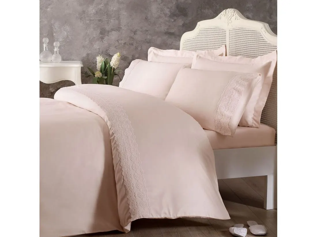 Ekskluzywny komplet pościel z kolekcji Guipure został wykonany z najwyższej jakości 100 % bawełny o gęstym satynowym splocie jest miły i delikatny w dotyku. Efektowne dekoracyjne doszycia delikatnej koronki na pościeli sprawiają, że pościel nada wyrafinowany elegancki wygląd naszej sypialni. Subtelne wzornictwo oraz stonowana kolorystyka pozwoli dobrać komplet pościeli do każdej sypialni nadając jej niepowtarzalnego eleganckiego uroku.