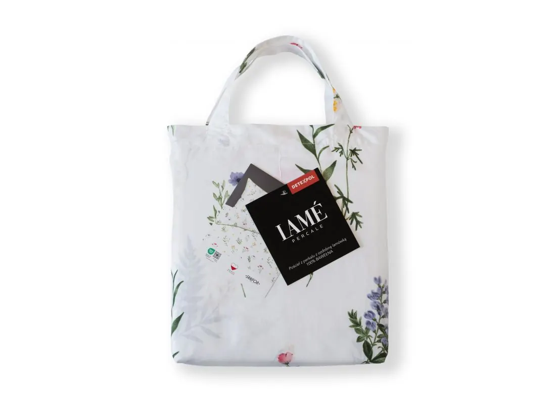 Każdy komplet pościeli Lame Percale zapakowany jest w dedykowaną torbę wykonaną z tej samej, perkalowej tkaniny. Dzięki niej można od razu ocenić jakość i wzór materiału, a później wykorzystać ją jako praktyczną torbę na zakupy.
