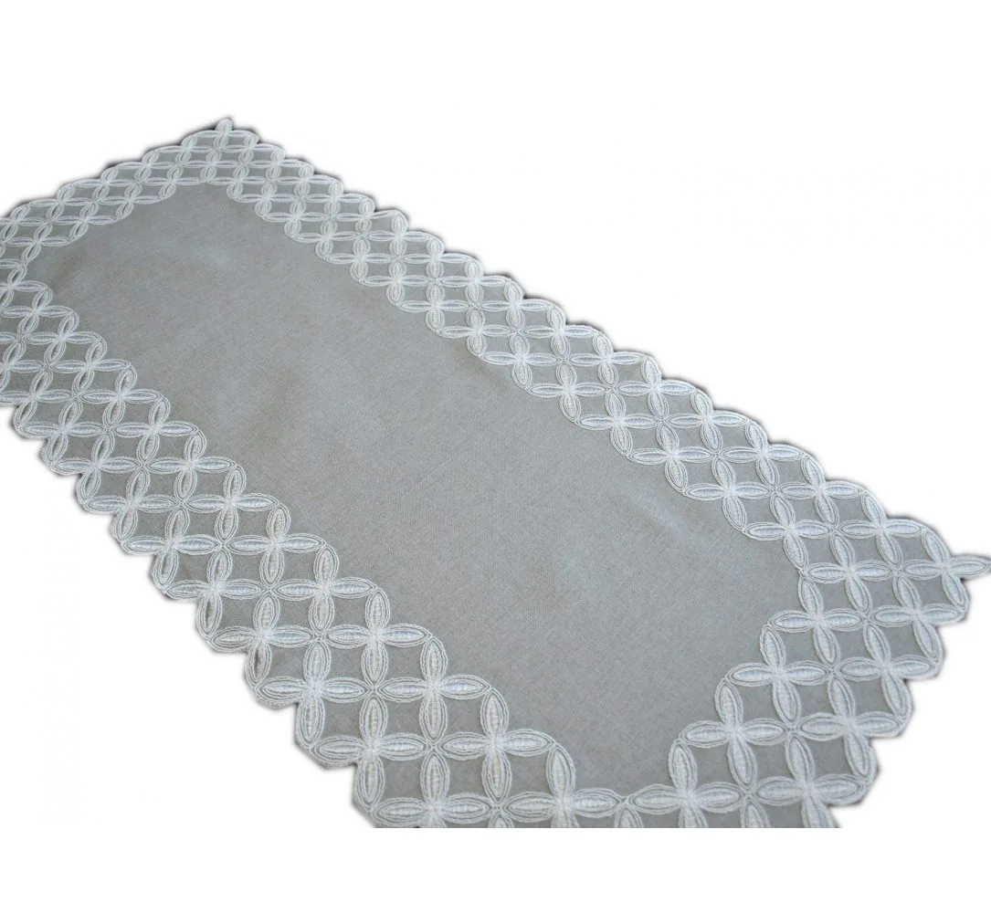 Ten wyjątkowy bieżnik przyciąga wzrok swoim precyzyjnym wzornictwem. Na stonowanej, szarej bazie rozmieszczono śnieżnobiałe, haftowane kwiatuszki, które tworzą subtelną, a zarazem wyraźną dekorację. Brzegi bieżnika zostały wykończone w formie eleganckich fal, które dodatkowo zdobi szeroki pas ażurowego haftu o geometrycznym splocie. To połączenie pełnego materiału z delikatnymi prześwitami nadaje produktowi lekkości i sprawia, że wygląda on na stole niczym biżuteria. Każdy detal haftu jest wypukły i starannie wykończony, co podkreśla wysoką jakość rzemiosła.