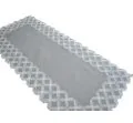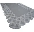 Rada stylistki: Aby w pełni wydobyć urok ażurowych wycięć, rozłóż bieżnik na gładkim, jednolitym blacie. Biały haft na szarym tle najlepiej komponuje się ze srebrnymi dodatkami oraz świeżymi kwiatami w wazonie.