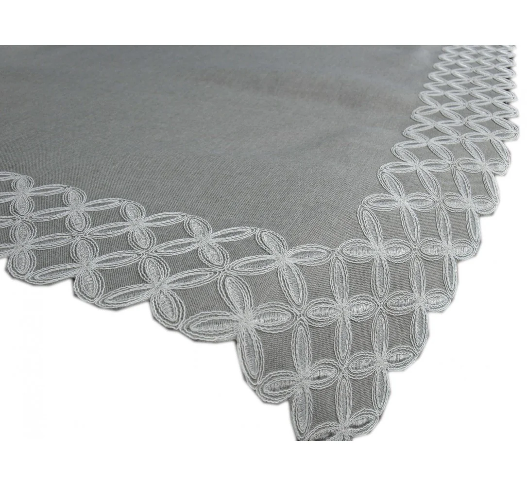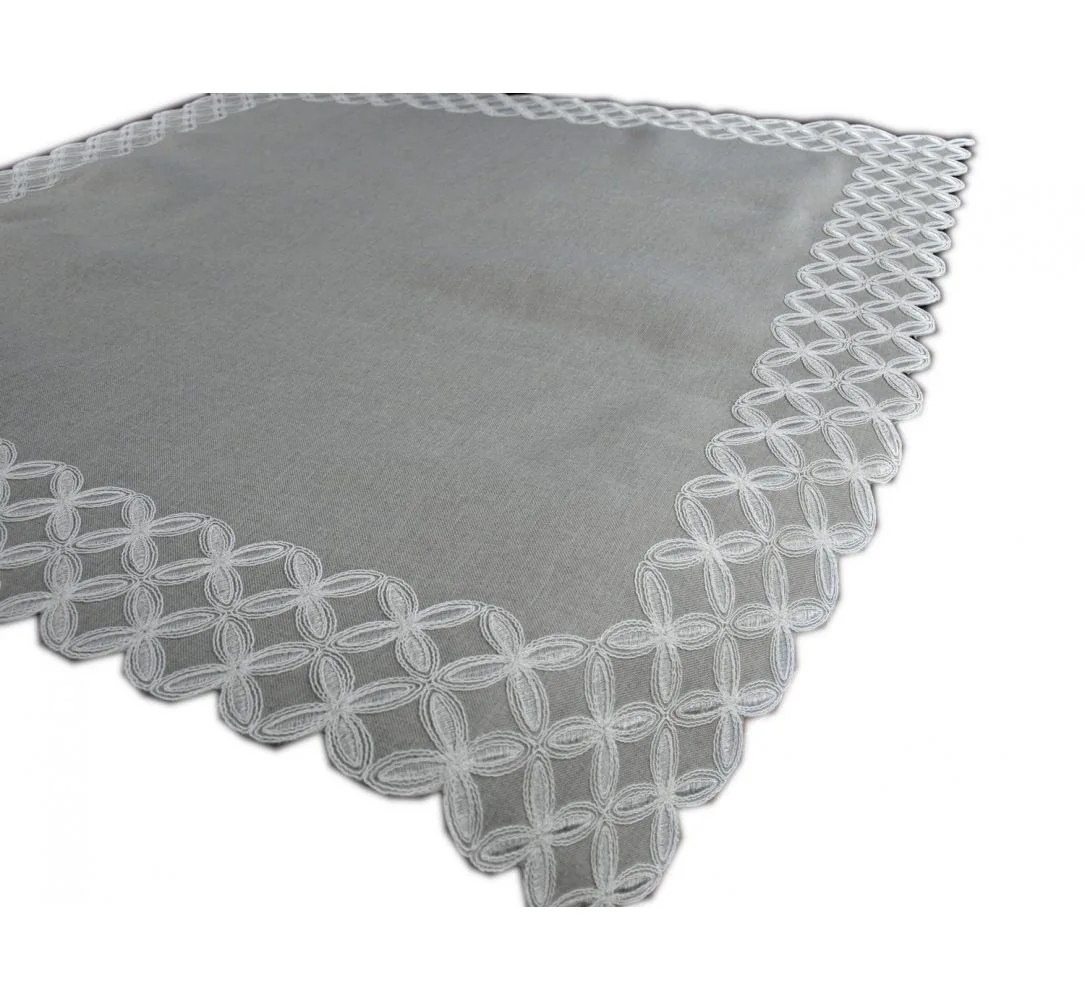 Ten kwadratowy bieżnik o wymiarach 85x85 cm przyciąga wzrok swoim precyzyjnym wzornictwem. Na stonowanej, szarej bazie rozmieszczono śnieżnobiałe, haftowane kwiatuszki, które tworzą subtelną, a zarazem wyraźną dekorację. Brzegi nakładki zostały wykończone w formie eleganckich fal, które dodatkowo zdobi szeroki pas ażurowego haftu o geometrycznym splocie. To połączenie pełnego materiału z delikatnymi prześwitami nadaje produktowi lekkości i sprawia, że wygląda on na stole niczym biżuteria. Każdy detal haftu jest wypukły i starannie wykończony, co podkreśla wysoką jakość rzemiosła.
