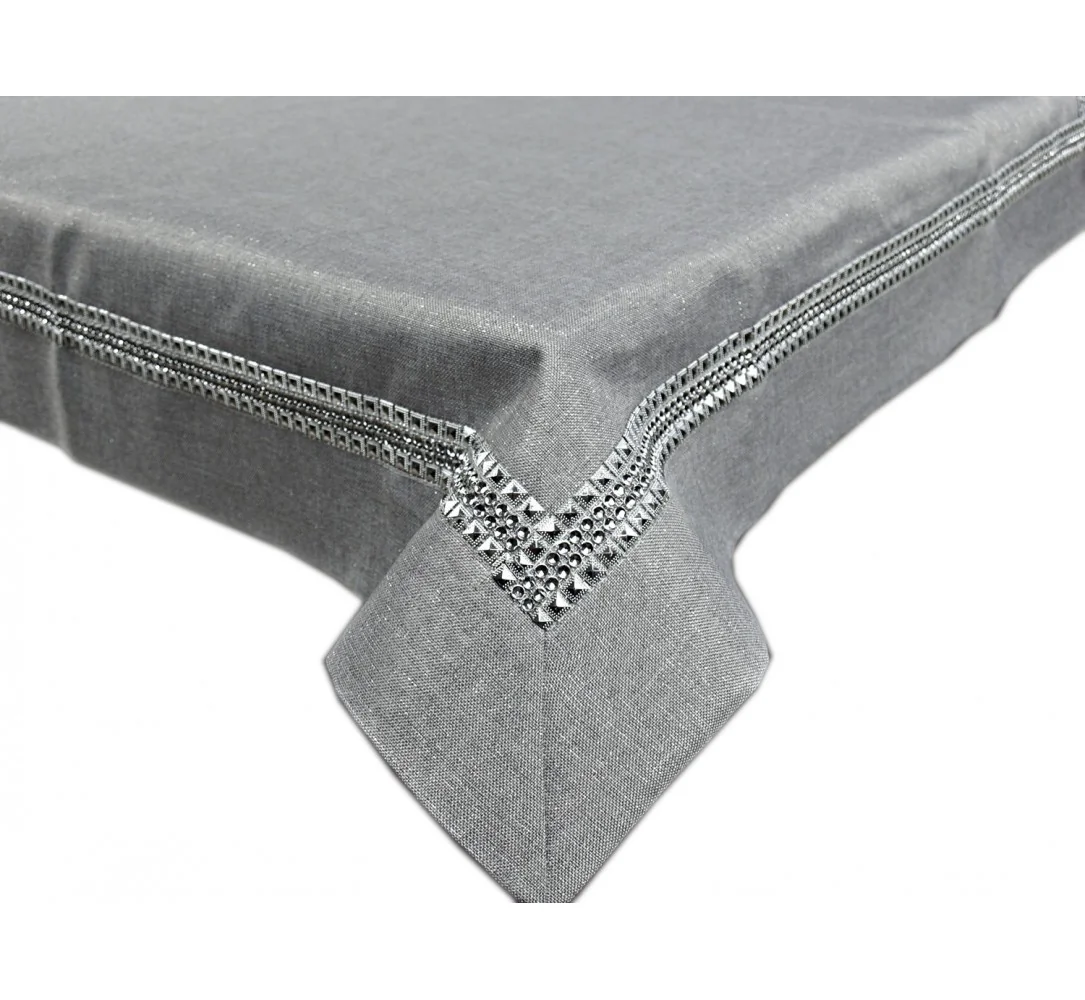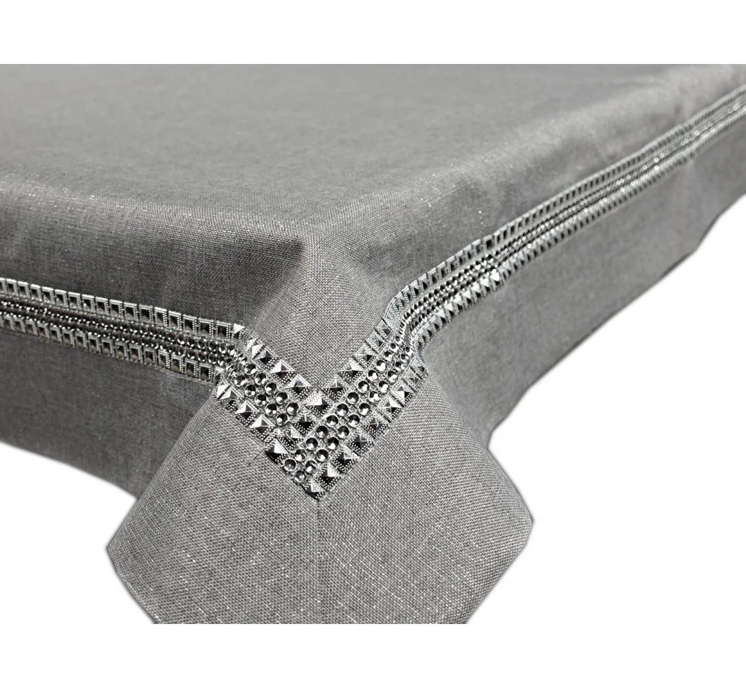 Elegancki Obrus Szary 150x260 cm – Kolekcja Lurex z Dekoracyjną Listwą Cyrkoniową