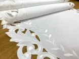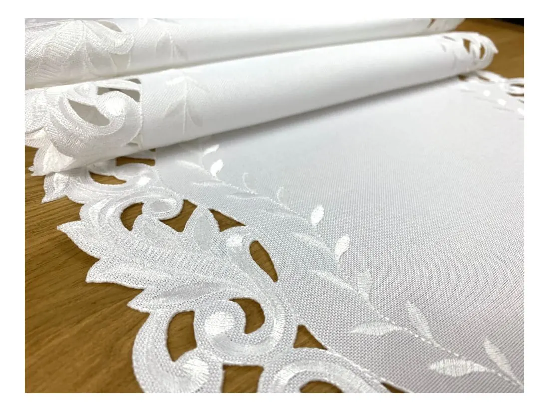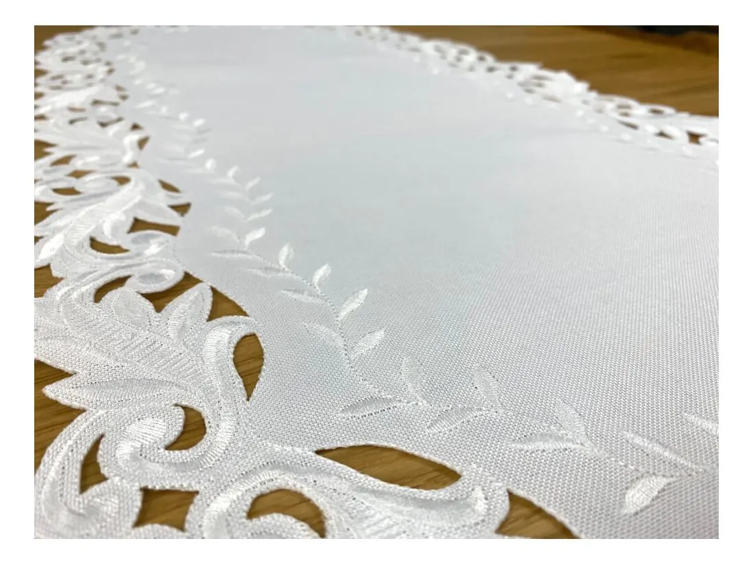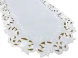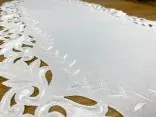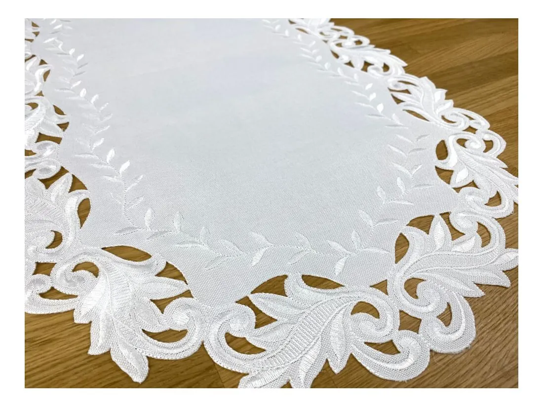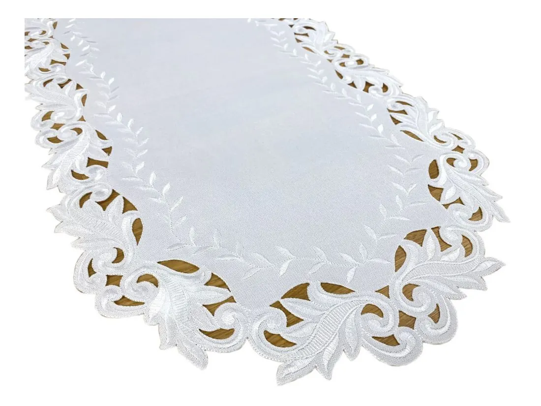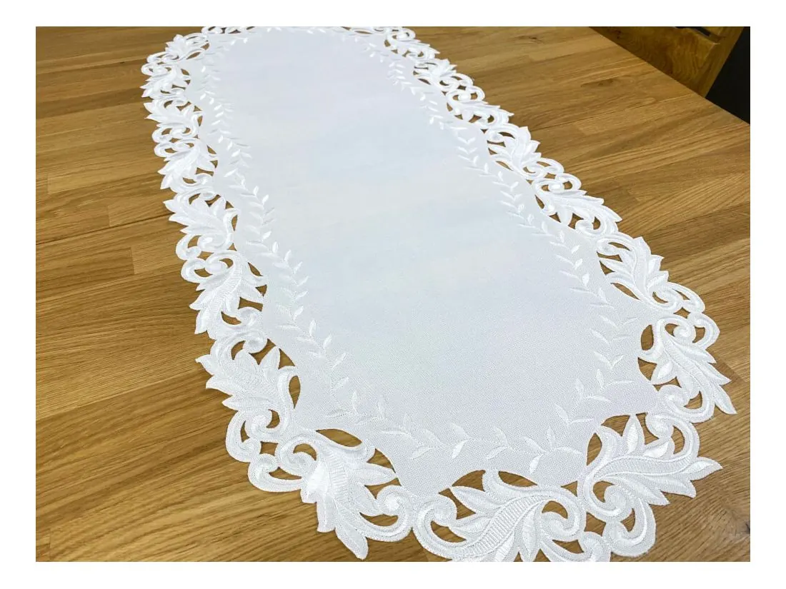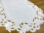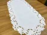 Dekoracyjna haftowany bieżnik w rozmiarze 60x120 cm w kolorze białym bogato haftowany i wycinany na brzegach, został wykonany na tkaninie - 100 % poliestrowej, charakteryzuje się nowoczesnym desingiem, prostym wzorem oraz modnym kolorem.