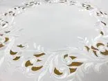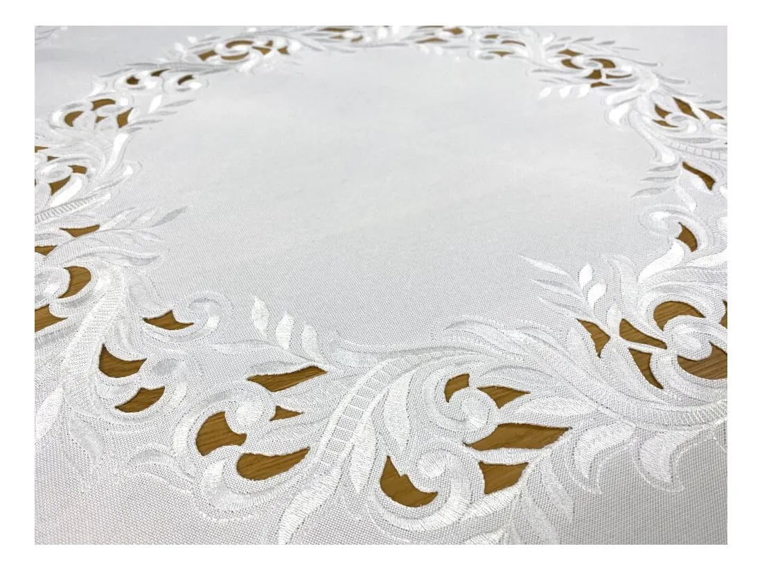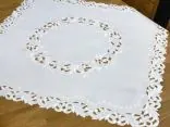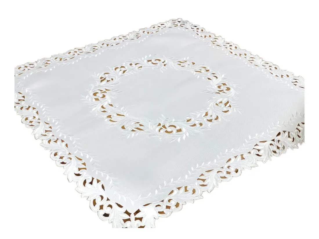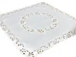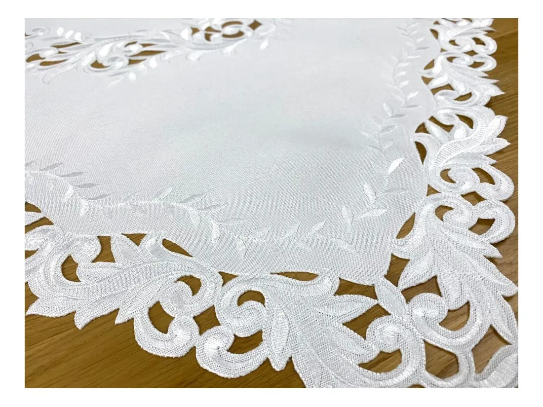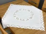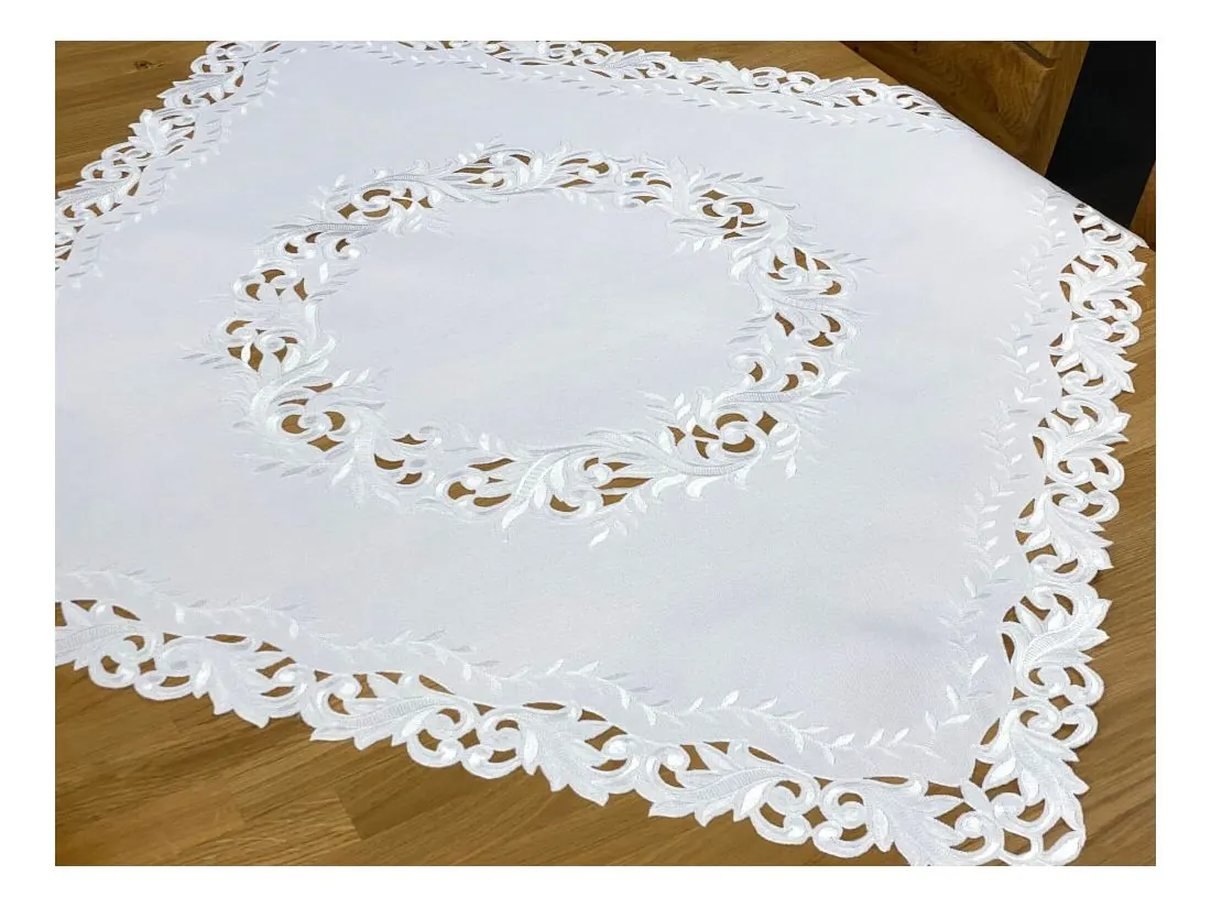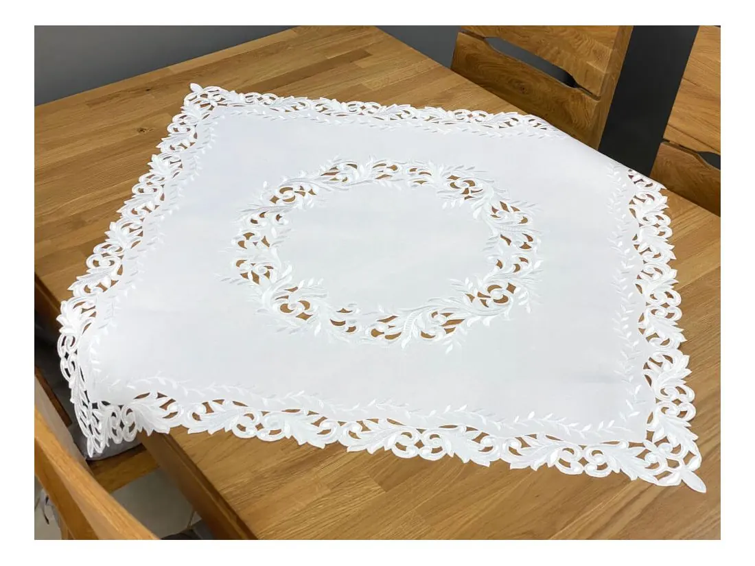 Dekoracyjna haftowany bieżnik w rozmiarze 85x85 cm w kolorze białym bogato haftowany i wycinany na brzegach, został wykonany na tkaninie - 100 % poliestrowej, charakteryzuje się nowoczesnym desingiem, prostym wzorem oraz modnym kolorem.