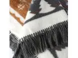 Koc wykonany jest z mieszanki materiałów: 58% bawełny, 32% akrylu oraz 10% poliestru, co gwarantuje miękkość, trwałość i komfort użytkowania. Gramatura 450 g/m² zapewnia odpowiednią izolację cieplną, dzięki czemu koc jest ciepły, a jednocześnie lekki. Wykończony jest efektownymi frędzlami na dwóch krótszych bokach, które dodają mu stylowego, dekoracyjnego akcentu.