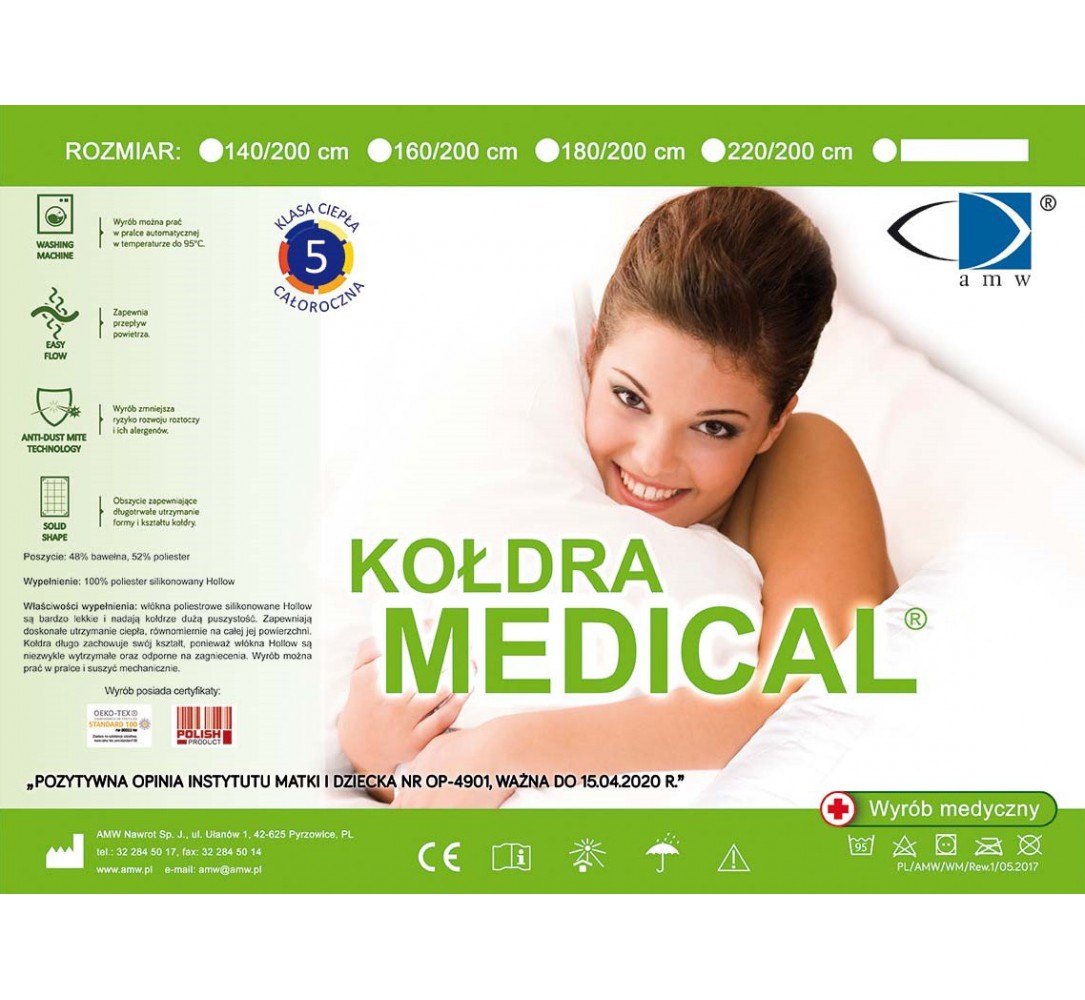 Kołdra całoroczna Medical®+ 140x200 cm antyalergiczna, produkowana przez polskiego producenta AMW, to wysokiej jakości wyrób medyczny. Kołdra ta jest zaprojektowana z myślą o zapewnieniu komfortu i bezpieczeństwa osobom o wrażliwej skórze i skłonności do alergii.