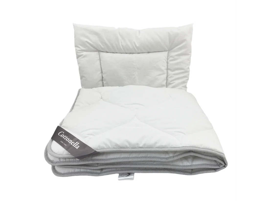 Komplet dla niemowląt i małych dzieci, w skład którego wchodzą całoroczna antyalergiczna bawełniana kołderka całoroczna w rozmiarze 100x135 cm oraz płaska poduszka 40x60 cm polskiej firmy Poldaun. To wyjątkowo komfortowa i bezpieczna kołdra stworzona z hypoalergicznych surowców która jest lekka i oddychająca.