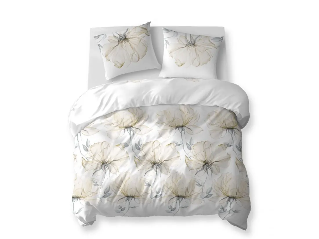 Wzór tej pościeli bawełnianej to wyjątkowo subtelna propozycja dla miłośników minimalistycznej elegancji. Na śnieżnobiałym tle znajdują się duże, rozłożyste kwiaty o półprzezroczystych, eterycznych płatkach w delikatnych beżach i szarościach. Płatki zostały narysowane lekką, zwiewną kreską w stylu akwarelowym, co nadaje wzorowi niezwykłej lekkości i przestronności.