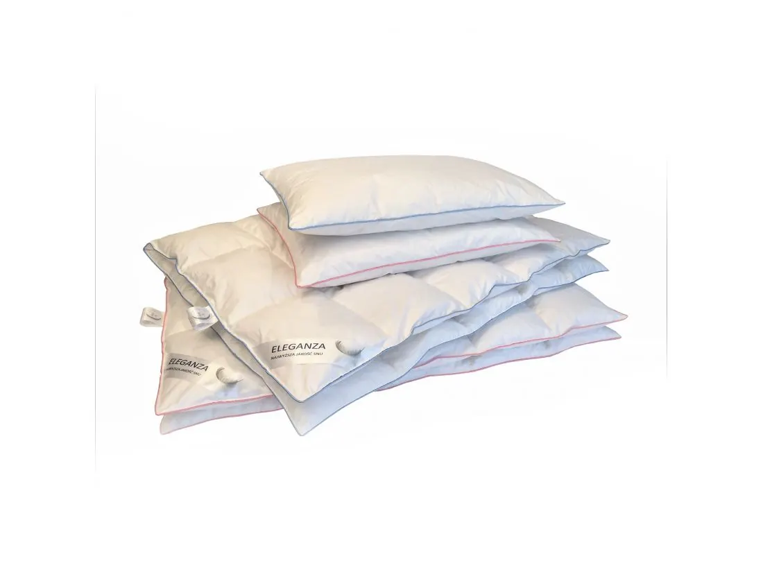 Komplet puchowy dla niemowląt, w skład którego wchodzą puchowa zimowa kołderka w rozmiarze 90x120 cm oraz płaska puchowa poduszka 40x60 cm polskiego producenta Poldaun. Zestaw Eleganza dla chłopczyka zapewnia najwyższy komfort w czasie snu. Produkty z kolekcji Eleganza cieszą się uznaniem wśród najbardziej wymagających klientów z uwagi na wyjątkowe wypełnienie - 90% polski biały puch gęsi. W kołdrze zastosowano odpowiednią wagę wypełnienia oraz odpowiedniej