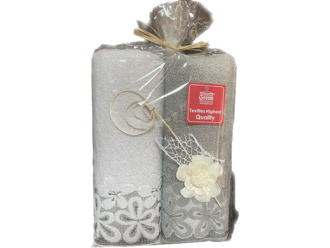 Komplet ręczników Bella składa się z 2 sztuk w rozmiarze 70x140 cm marki Greno, to oryginalny pomysł na prezent dla bliskiej osoby. Ręcznik Bella jest delikatny, mięsisty miły w dotyku z delikatną aplikacją kwiatową wykonany z wysokogatunkowej 100 % bawełny, posiada dużą chłonność wody. Upominek składa się z dwóch ręczników w rozmiarze 70x140 cm dekoracyjnie złożone w rulonik, ozdobiony delikatną dekoracją nadając mu uroczysty charakter. Całość zapakowana jest w celofan gustownie związany rafią.