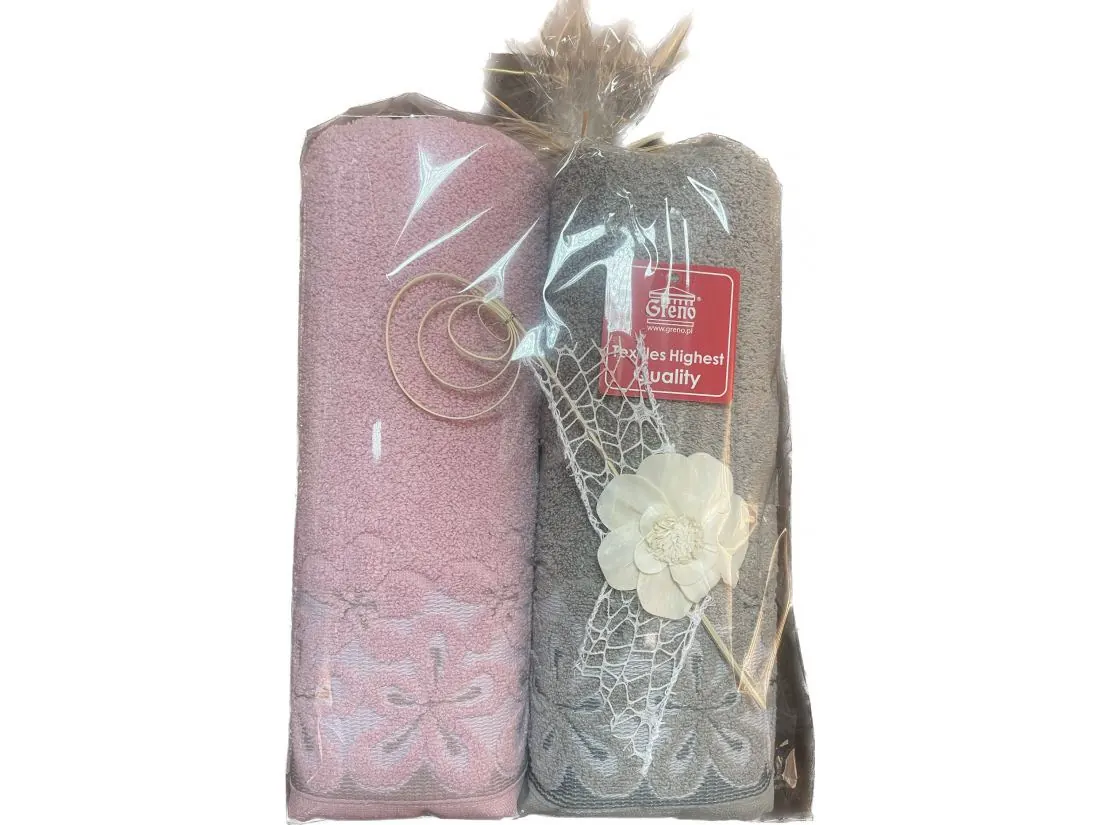 Komplet ręczników Bella składa się z 2 sztuk w rozmiarze 70x140 cm marki Greno, to oryginalny pomysł na prezent dla bliskiej osoby. Ręcznik Bella jest delikatny, mięsisty miły w dotyku z delikatną aplikacją kwiatową wykonany z wysokogatunkowej 100 % bawełny, posiada dużą chłonność wody. Upominek składa się z dwóch ręczników w rozmiarze 70x140 cm dekoracyjnie złożone w rulonik, ozdobiony delikatną dekoracją nadając mu uroczysty charakter. Całość zapakowana jest w celofan gustownie związany rafią.