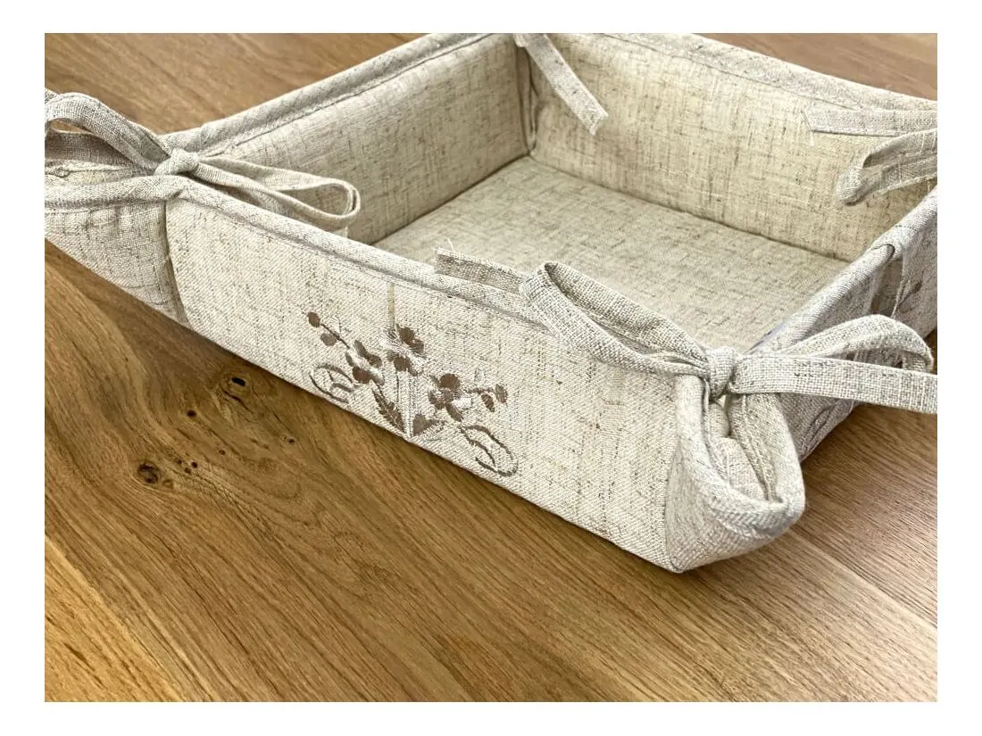 Po związaniu rogów koszyk osiąga rozmiar 20x20 cm i wysokość 7,5 cm, tworząc praktyczne i stabilne miejsce na pieczywo, słodycze lub inne drobiazgi. Każdy bok zdobi subtelny, haftowany motyw, który dodaje mu elegancji i wyjątkowego charakteru.