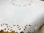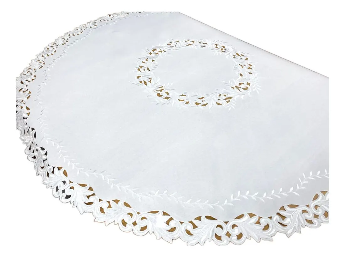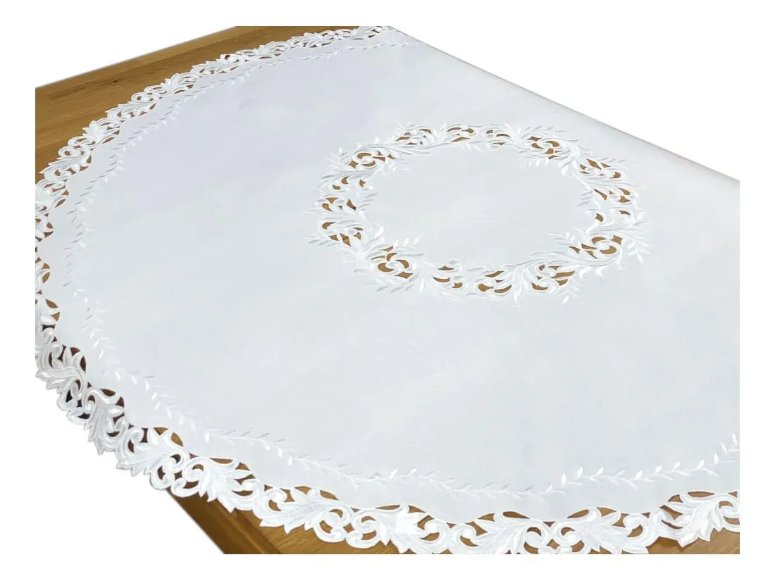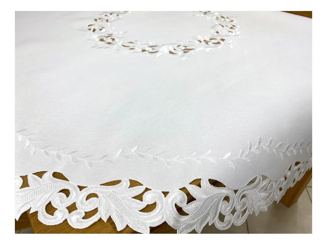 Biały, haftowany obrus to produkt uniwersalny, który z łatwością dopasuje się do charakteru Twojego domu. Dzięki nieskazitelnej bieli i ażurowym motywom, doskonale odnajdzie się w stylach: